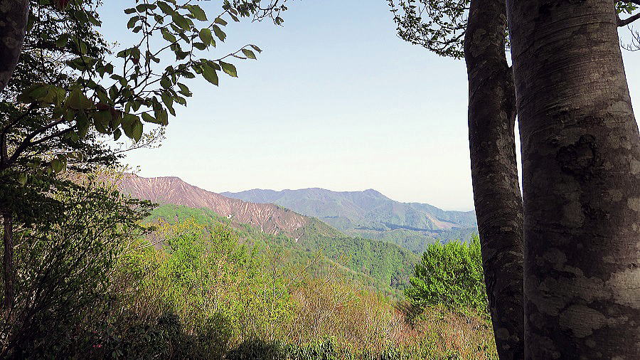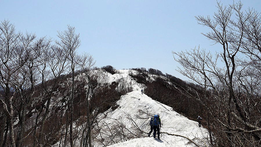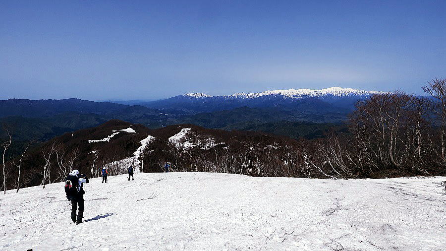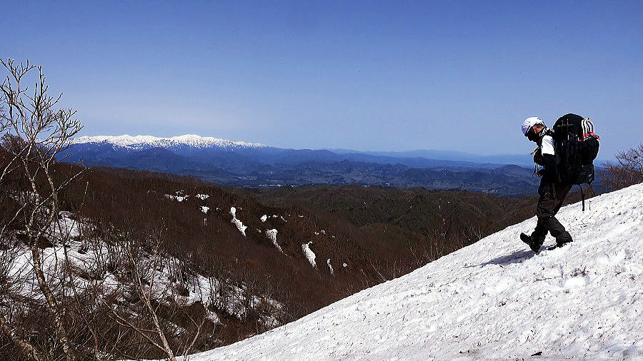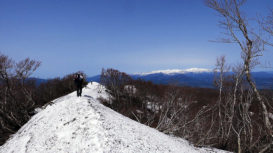 | 標高900m前後から、飯豊の麗姿が現れて常に後ろについてくる。歩を止めて振り返ればいつもそこに絶景。 | ||||