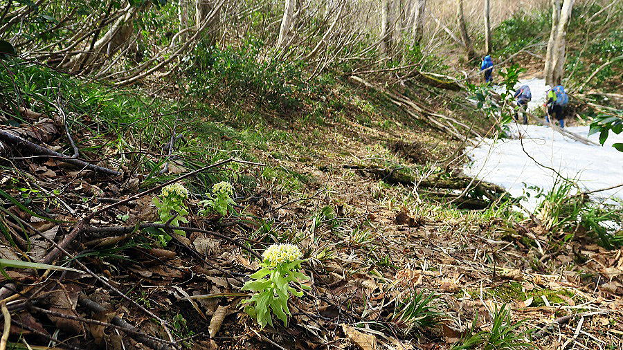 | 標高700mを越えたら雪が融けたばかりで、フキノトウ。残雪の道が始まる。倒木で難儀な道。 | ||||