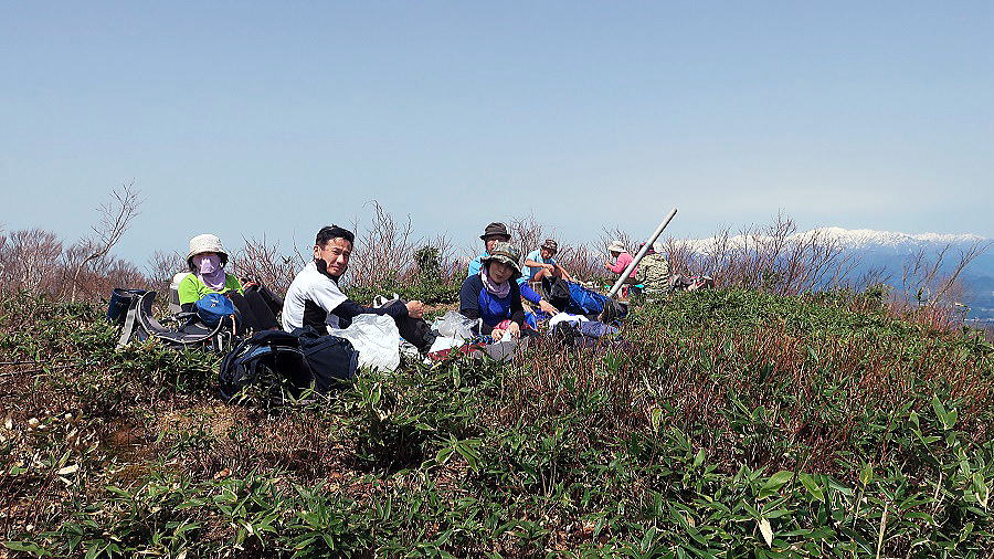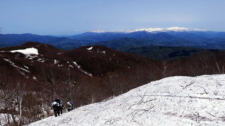 | この連休は2泊3日で大朝日岳を予定していた。Unqさんは5人×3日分の食糧をすっかり用意していた。ところが天候が整わない。山梨方面は好予報なのだがコロナで遠征は自粛。近辺予報は4日だけ絶好天。さて、どこの山にしようか。思い残している山があった。1年前、山頂目前でタイムオーバー、引き返した日本平山。よしそこだ。前回より1時間早く集合して、余裕を持たせた。結果、大成功。途中、雪で倒れた木の障害物や藪漕ぎがあったものの計画通りに山頂に達し、一等三角点にタッチ。終日天候に恵まれて眺望の素晴らしいこと。往き返りずっと飯豊の白峰が一緒。見飽きることのない麗姿。固く締まった残雪の急斜面に靴先を蹴り込んで登るキックステップの心地よさ。歌の一つ二つも出ようというもの。歩行距離17㎞、累積標高1340m、所要時間12時間20分の長い長い山歩き。大朝日に代えても余りある山行ではありました。さて、3日分の食糧はどこで使おうか。上の写真は標高930m地点、飯豊の麗姿に向かってポーズをとってもらった。 | ||||