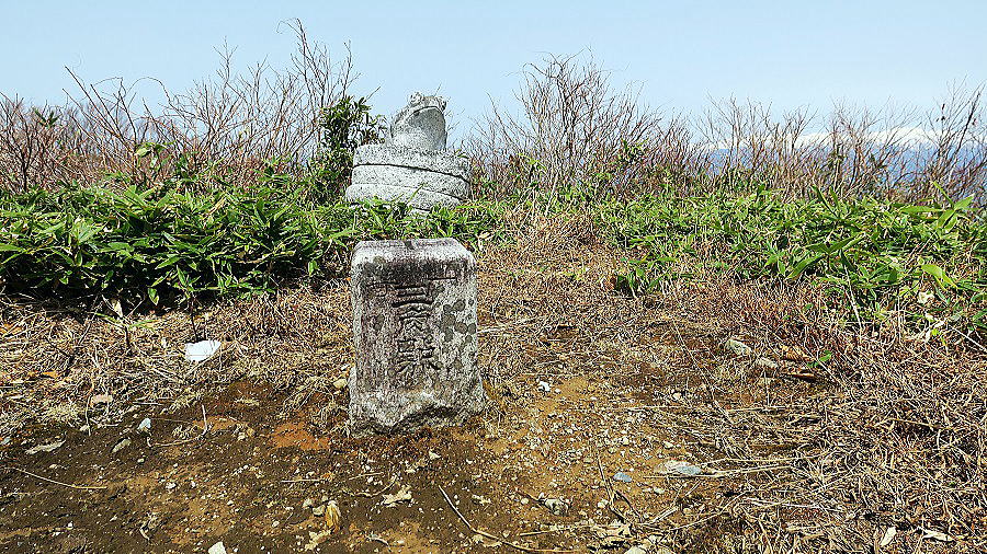 | 念願の山頂一等三角点にタッチ。さすが一等、風格が違う。うしろのカエルはなんだろう?雨乞いだろうか。 | ||||