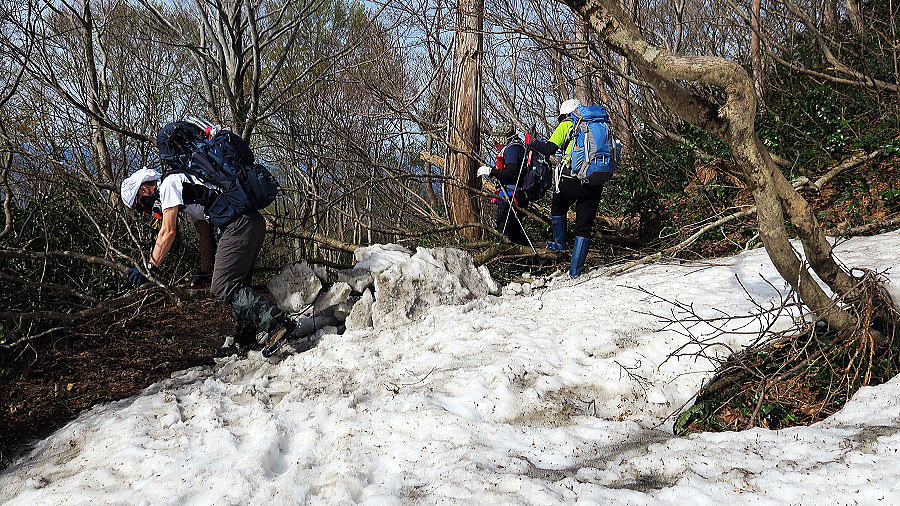 | 半端な残雪は倒木で大難儀。まるで競馬の大障害物。 | ||||