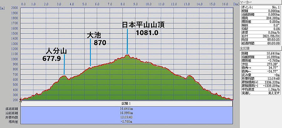 | 歩行距離17㎞ 高度差881m 累積標高1340m 登り6時間10分 下り4時間20分 | ||||