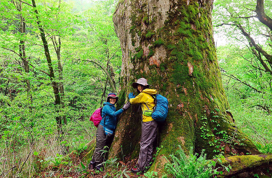 | 前日下界は黄砂で霞んだ。にもかかわらず、この日、深山の緑はしっとり艶やか。2年ぶりの沼奥山の巨木ツアー。巨木1号は相変わらず30m近い巨体ですくっと立って迎えてくれた。巨木2号の下へ行き、洞穴の前で集合写真。見上げれば、頭上から見下ろす穏やかな目、口、鼻。シシ神だという人あり。確かにこれは森の精霊・森の化身。山に棲む無数の動物、無数の樹木、無数の草花の集合体。「我と共にあれ!」ふと聞こえたような。 |