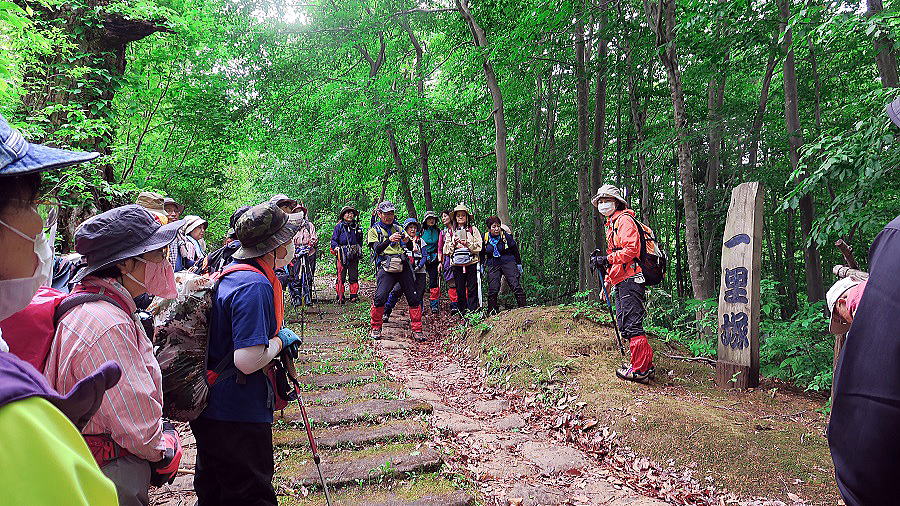 | この敷石、3600段あるという。廃道となって100年、その間に埋もれてしまった敷石を掘り出したのが昭和55年からとのこと。それから5年間、のべ2000人の作業でここまでよみがえらせたのだと。地元黒沢集落の取り組みの成果。 |