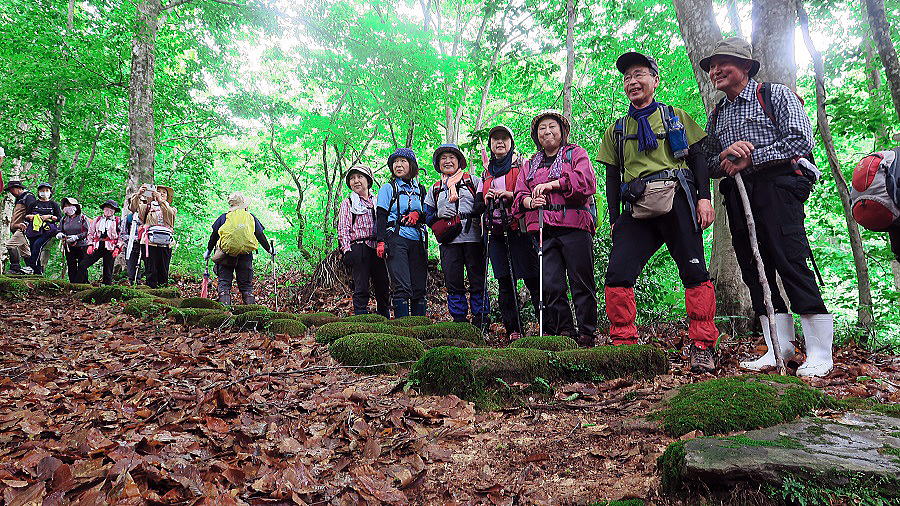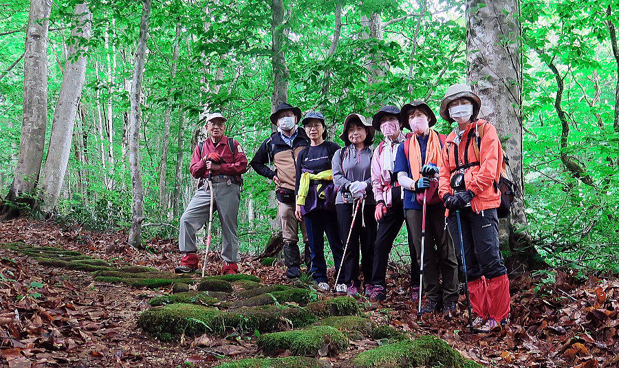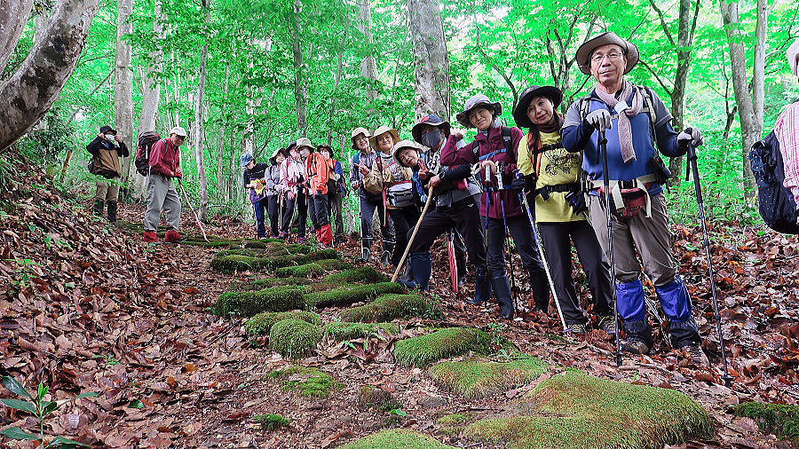 | どうだ!この笑顔には、さすがの雨雲も敵うまい。時ならぬ長雨続き、前日も当日の朝も、雨。有料の「天くら」予報を頼りに、決行としてはみたものの、もし予報が外れた最悪場合は傘さし立ち昼食も覚悟の上。もっとも、これまでの度重なる山行で信頼度抜群の「天くら」のこと、今回もまったく信頼通りに予報ドンピシャリ。登山開始直前に雨は上がった。しかも、石畳の苔は、前日来の雨のお陰で緑しっとり。半信半疑で雨合羽に身を固めた参加者も、徐々に雨具を脱ぎ始め、峠の頂に着いた頃にはこの笑顔。と思ってよくよくつぶさに検討したら、笑ってない人一名、視線不合の人一名、顔隠れ一名、いや~失礼しました。もう少し写真撮影人の腕を上げなくちゃ~と反省反省。越後米沢街道十三峠を歩く会、今日で8峠め、ここは名高い黒沢峠。 |