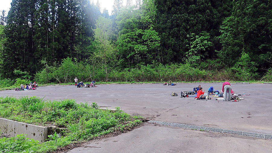 | 市野々側に下りて、大駐車場で大休止。途中の車道が通行止めで、ここは貸し切り大広間。 |