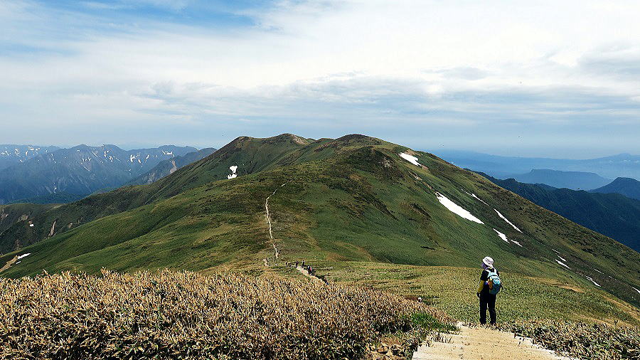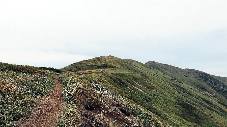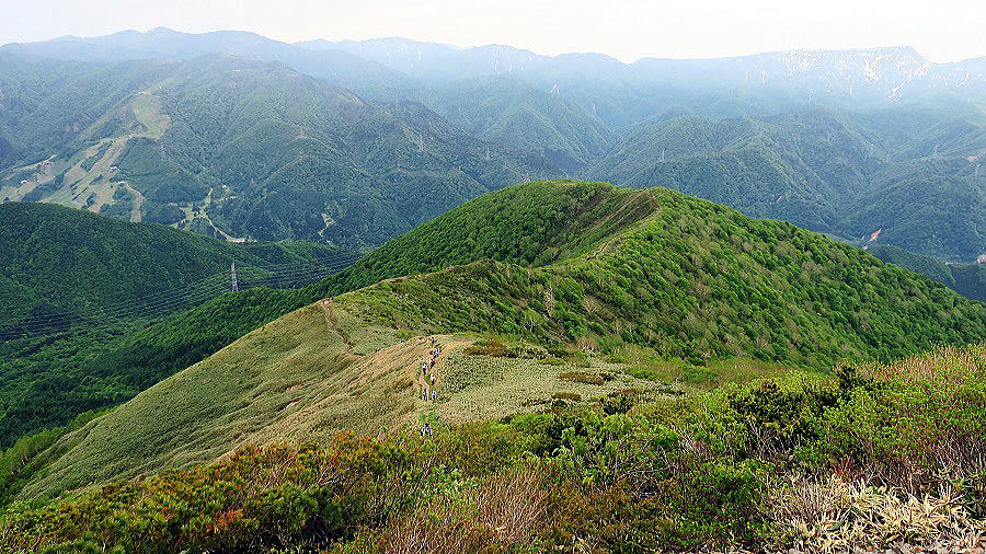| 平標山へ戻る道 平らなようでそれが中々 中央奥に苗場山 | ||||