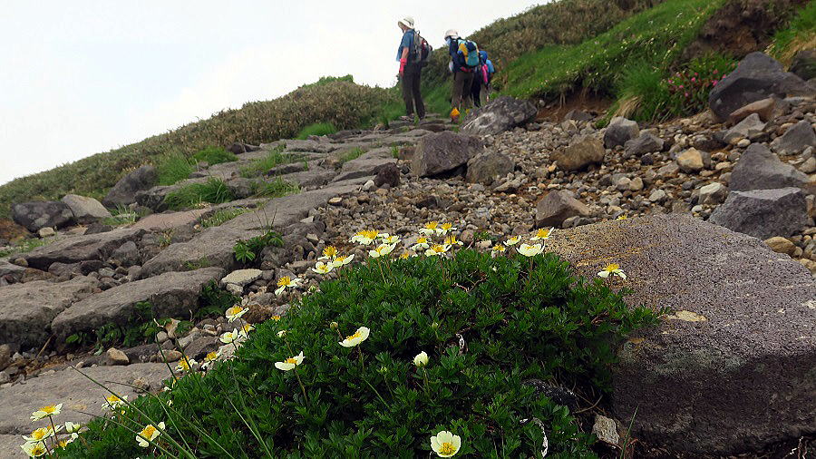 | 賽の河原は、さながら岩石と花の庭園 チングルマとイワカガミ |