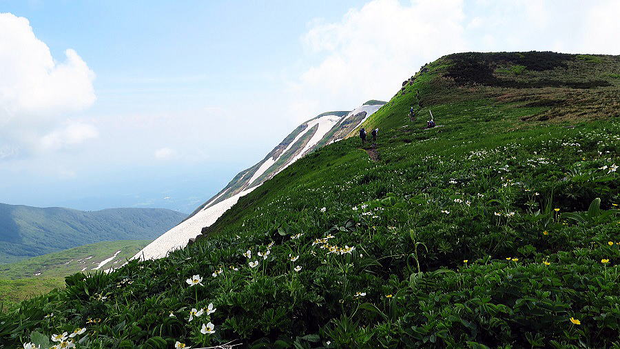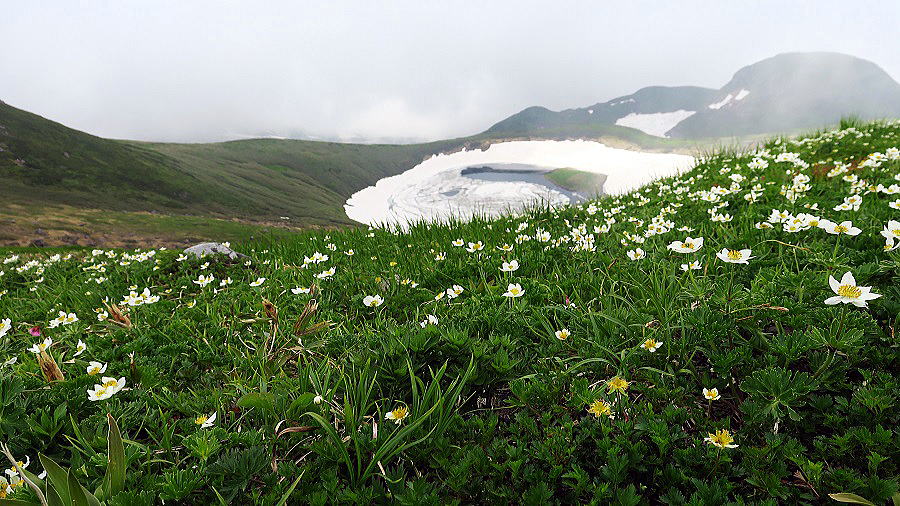 | かつて同じ職場で濃密な付き合いもあったOさんが亡くなった。1歳年上、最近までお元気だったのに突然の訃報。昨日、安らかな寝顔にお別れの挨拶をしてきた。それで今日の葬儀は失礼して、山へ来た。もっとも今はコロナでどこも参列ご遠慮だから、失礼には当らないのかもしれないが。このところ、親しかった人の訃報が続く。もうすでに一年一年の歳に入っている。来年のことは分からない。一年一年。マラソンと同じ。へばったら差し当たって1㎞だけ進んでみる。その先どうなるかは進んでみなければ分からない。去年と同じ時期にこうやって、今年も仲間と鳥海湖に来れた。湖の下へ降りて縁を回り、急斜面の雪渓を恐々登った6人の冒険者たち。カメラの先には鳥海湖と鳥海山の山頂。滅多にない角度から撮影できた。想定外の冒険のお陰。とりあえずの1㎞の先は、進んでみなければ分からないが、進んでみればいつも心動かす何かが待っている。一年一年、一キロ一キロ、一歩一歩。白山一華の白と深山金梅の黄が色鮮やかな鳥海山だった。 |