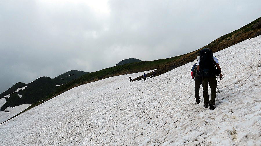 | 思わぬ急斜面の雪渓を恐々トラバース |