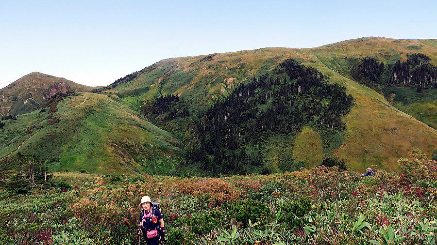 | 巻機山の山頂部 とてもなだらかでどっしりした山 あっちがほんもので、こっちはにせもの?それはどうでもよいとして なんとも雄大な、それに草紅葉の始まった山肌の色合いといい、やわらかさといい |