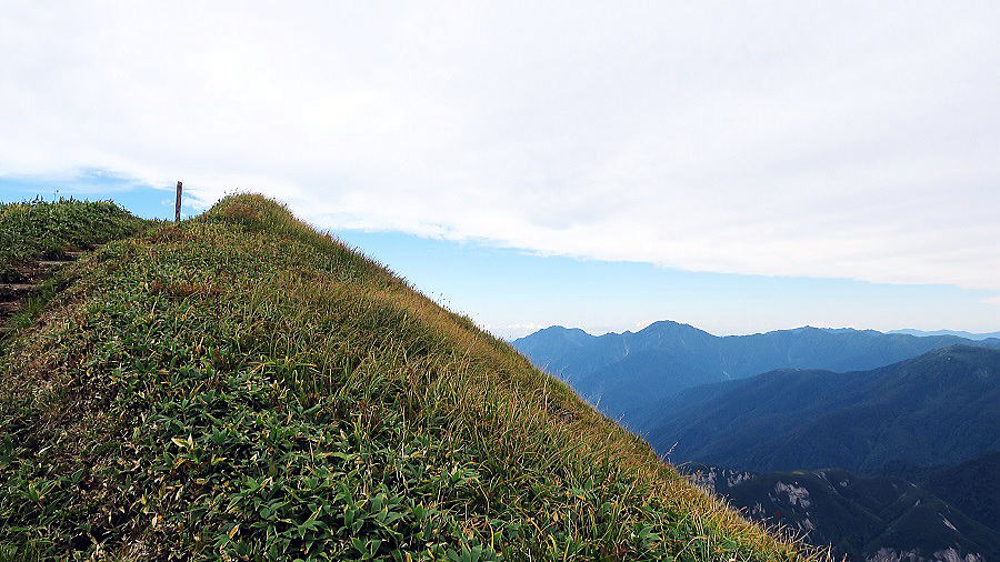 | ケルンが本当の巻機山頂、最高点。なだらかに見えても起伏はある。それが山というもの。 | ||||