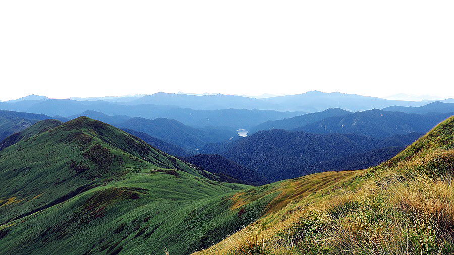 | 右端の巻機山山頂1967mから牛ヶ岳1961mに繋がる稜線、起伏のないなだらかな天上の道。背の荷は山頂の向こうの御機屋1933mに置いてきたから身は軽い。靴も今流行りの軽靴。トレイルランを気取って駆けてみた。2000mの天空ジョギング。なんともはや、気持ちの良いこと。それにここは、大分水嶺。右に降った雨は魚野川に流れ信濃川となって日本海へ。左に降った雨は真下の奥利根湖に貯まり、やがて太平洋へ。日本の脊梁を走っている、なんとも雄大な気分。正面奥の山並みは、谷川連峰。向かって左から谷川岳、一ノ倉岳、茂倉岳の三ピークが並び、万太郎山、仙ノ倉山の頂が見える。今、牛ヶ岳に駆けあがってくるUnqさんの背後の稜線は、巻機から朝日岳へ繋がり、そこから右へ下れば謙信越山の道・清水峠に出、さらにぐるっと回って茂倉岳から谷川岳に繋がる。朝日岳から左へ進めば、笠ヶ岳、白毛門。馬蹄形縦走と言われるその道は、望みながらまだ果たせないまま。来月から後期高齢者、もう体力も残りわずか。想いだけは天空を駆ける。8年ぶりの巻機山。 | ||||