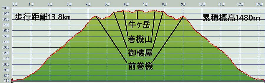 | <コースとタイム> 桜坂登山口7:36ー8:49五合目尾根上ー9:36六合目展望台ー11:30前巻機ー12:10御機屋(山頂標柱)12:50ー13:03山頂13:08ー13:20牛ヶ岳ー13:28稜線先端ー13:51御機屋13:55ー16:10五合目16:27ー17:24桜坂登山口 |