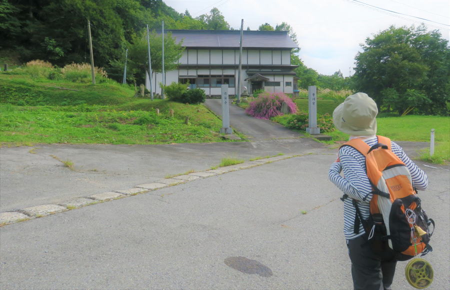 | 市野々宿の入口、観音坂、別名、鐙(あぶみ)坂。「ここから市野々を見下ろす景観は、まことに美しい。南北朝時代、南朝の忠臣、楠木正成の四男正儀の嫡子正勝こと傑堂能勝和尚が、亀岡文殊参けいの帰途、この観音坂に休らいだとき、騎馬の「鐙が夕日に輝いた」というので鐙坂ともいうという伝説がある。」と、「小国の交通」に書いてある。市野々の地名は、もともとは「一布村」で、平家の落ち武者を一布と呼んだからだとも、山野自生の麻から麻布を作ったからだとも。傑堂和尚はこの地に飛泉寺を建て、ここで没したとも。さて、Tamuちゃんの話では、傑堂能勝和尚は村上市の耕雲寺の創建者でもあるとのこと。偉人たちの行動範囲の広いことにはただもう驚いてしまう。 | ||||