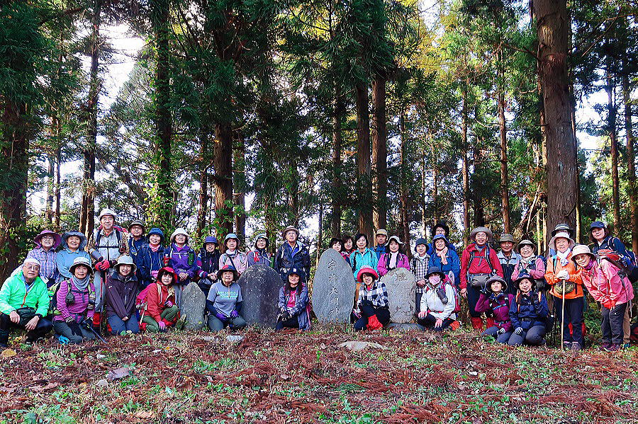| 落合地蔵尊まで下山して再度記念の集合写真。皆さんいい顔している。この場面には、こんなに綺麗だったかしらなんて声は絶対に出ない。 |