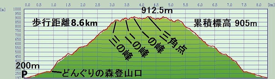 | <コースとタイム> P発6:30―6:55どんぐりの森登山口7:05―9:10三の峰9:15―9:35二の峰11:20―11:34前一の峰―11:52五頭山頂(三角点)12:05―12:20前一の峰12:37―12:58三の峰―14:26P着 |