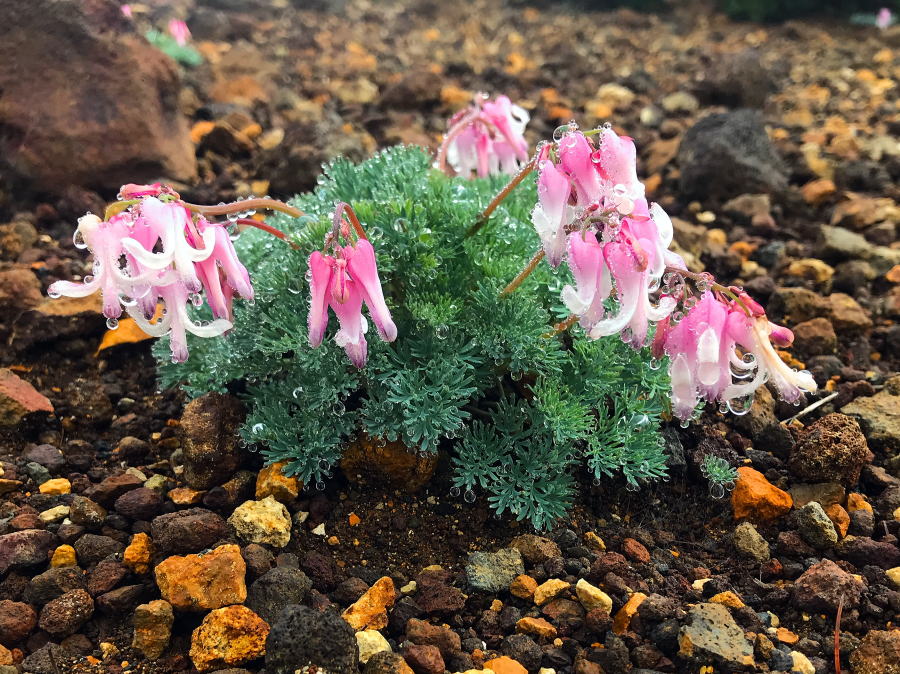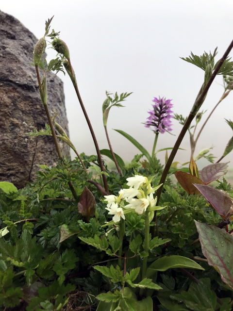 | 夏の蔵王は8年ぶりか。前回以上に花の山になっていた。雫を滴らせながら咲くコマクサ。荒地にこの花は、似合う。女王という雰囲気ではない。健気さそのもの。今日は、23日予定の公民館登山の下見。刈田岳のレストハウスで昼食をとってから、小雨模様の中をゆっくりスタート。道々、高嶺の花盛り。百花繚乱、千紫万紅。お陰で下界の熱は凌げるし、雫に濡れた花々はいいし。これは役得というもの。2週間後の本番までコマクサは残っていないかもしれないが、まだまだ、次々と花は咲いてくれそう。 | |||