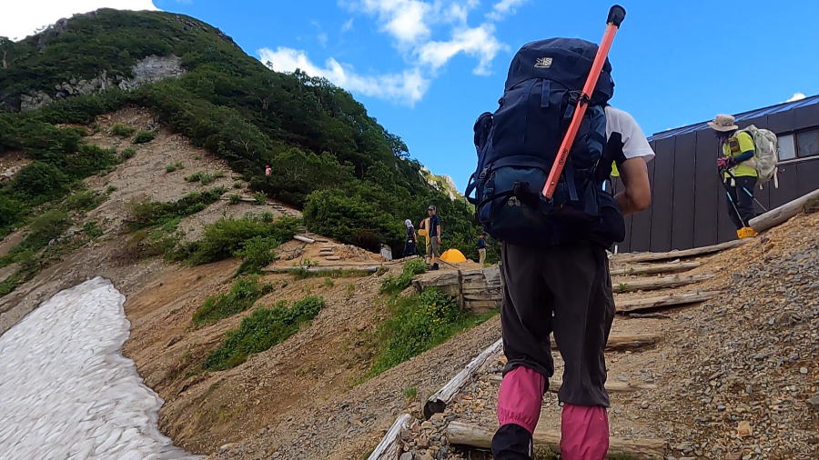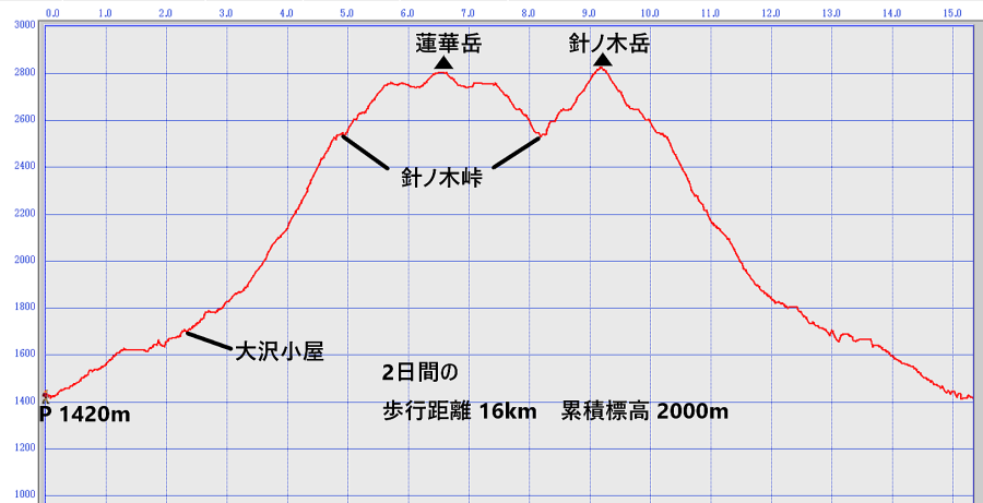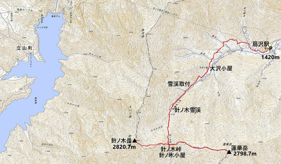 | <1日目> 扇沢駅P発8:30―10:14大沢小屋―10:55雪渓取付11:17―13:52針ノ木峠(小屋)14:27―15:55蓮華岳山頂―16:45針ノ木小屋(泊) |