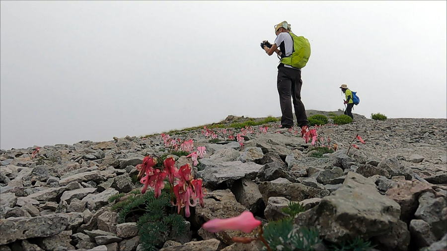 | 爺ヶ岳の頂に立った時、三大雪渓の一つだという針ノ木岳の雪渓を見た。あそこを登って針の先端に立ってみたいと思ってから5年。今、その雪渓に挑んでいる。固い雪面にアイゼンの爪を喰い込ませ、一歩一歩。急斜面の頭の上に、針ノ木峠の標識が見えた。この峠は、佐々成政サラサラ越えの現場。大河ドラマでいっとき有名になったが、歴史マニアでもこの現地に立つ人は少なかろう。峠の小屋で一休み。荷を置いて、先ずは蓮華岳へ。爺ヶ岳から見たとき、山頂部の長い大きな山だった。案に違わず長い長い山頂稜線。そこは花の園。小石を敷き詰めたガレ場の広い山頂部は一面のコマクサ。盛りは過ぎたというものの、どうしてどうして、姥桜も捨てたものではない。色は真紅になって、若い薄紅の花たちと競演共舞。誰もいなくなった天空で賑やかに賑やかに咲き舞い踊る花々。ここが天国でなくて何だろう。 | |||