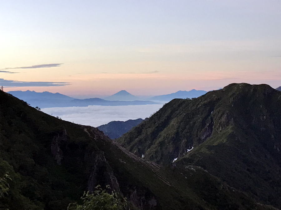 ![]() 二日目朝、針ノ木小屋前から 諏訪盆地越しの富士 |