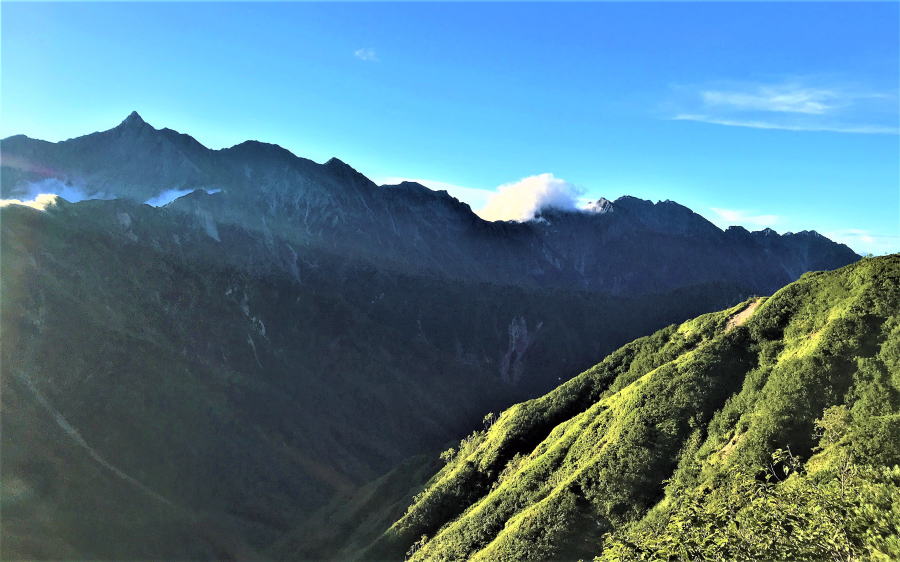 | 23日朝 双六小屋を出てすぐ 前方右端に朝陽を浴びて屹立する笠ヶ岳 左端のとんがりは抜戸岳 これから、あの峰々を踏破する ここの谷間を流れ下る双六沢が、双六岳の名の由来とか 沢の名の由来は、神様が降臨してさいころをふって遊んだからと いっそ、あの平らな山頂広場に降臨してさいころをふれば あまた居並ぶ峰々へ、双六で回れたのにと思うのだが |