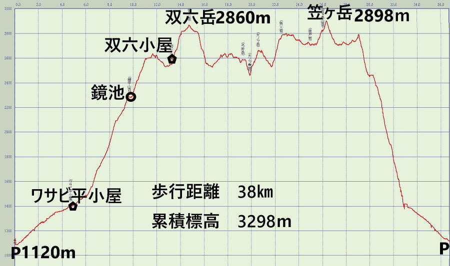| <21日>関川村発4:15-10:36新穂高温泉11:29-13:46ワサビ平小屋(泊) <22日>ワサビ平小屋発5:04-8:53鏡平9:37-10:44弓折分岐-12:06双六小屋13:06-14:12双六岳-15:00双六小屋(泊) <23日>双六小屋発5:27-7:31弓折岳-9:45秩父平10:06-13:33笠ヶ岳山荘(泊) <24日>笠ヶ岳山荘発5:39-5:56笠ヶ岳-6:16山荘-7:30抜戸分岐-12:05笠新道分岐12:30-14:00新穂高14:09-14:17飛岳の湯15:53-21:29関川村着 |