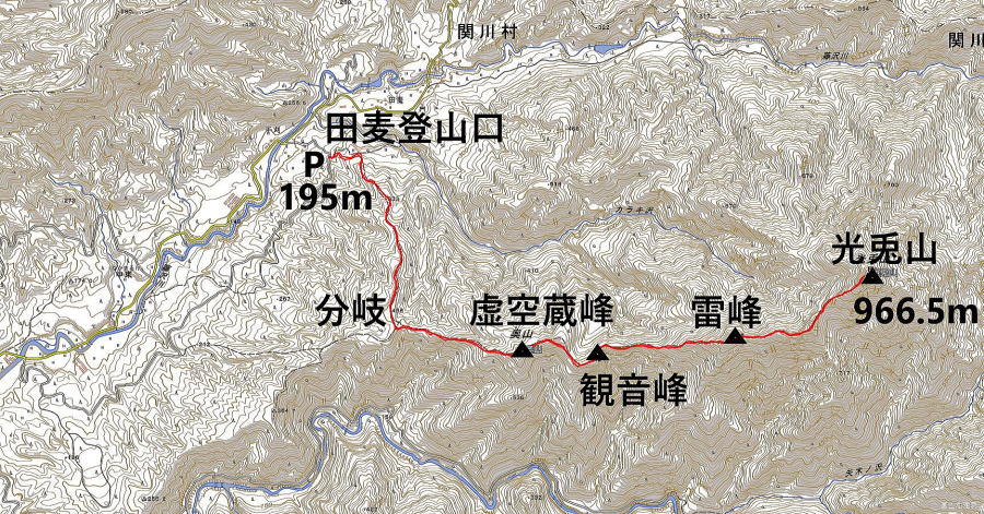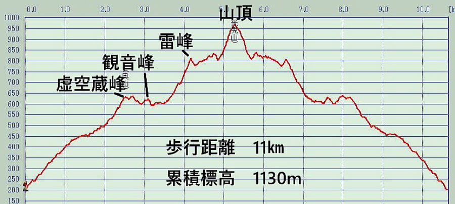 | 田麦登山口発8:00-9:04分岐9:12-9:55虚空蔵峰10:02-11:33雷峰11:46-12:55山頂14:17-15:32雷峰15:40-17:48登山口着 | |||
