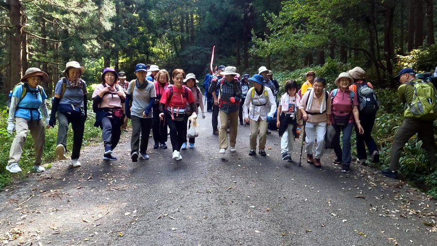 | ここは出羽街道、羽越国境の堀切峠 想定外の好転に恵まれて 善男善女、歩く、歩く 中継宿から小俣峠を越え、小俣宿で一休み そこから、ここ堀切峠まで来た ここを越えれば、羽州小名部宿 今、老若男女がまさに跳び越えているラインが 越後国と出羽国をふり分ける国境のライン 目に見えないそのラインを、一、二の、三で一斉に跳び越えたつもり 秋の一日、にぎやかにおしゃべりウォーキング 山中であれば、何の迷惑も無し 熊でさえ、じっと息をひそめて、うらやまし気に息を殺す ひと気の絶えた古街道、この時ばかりは往時の賑わい |