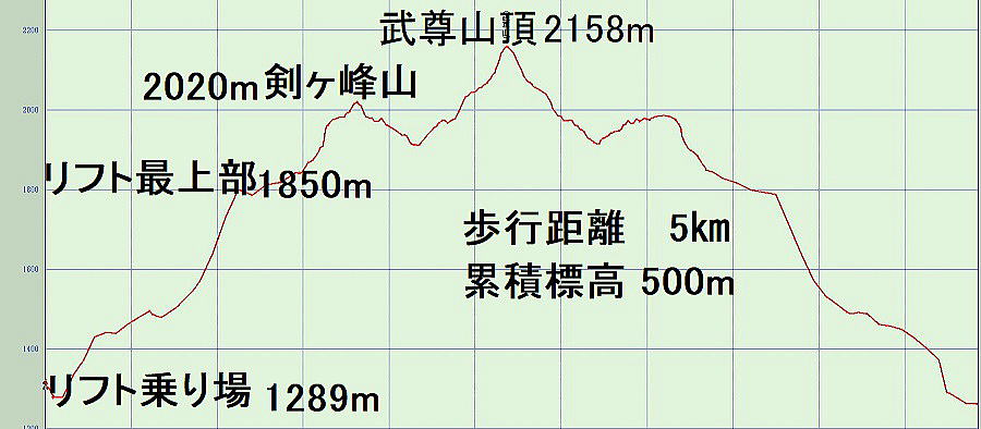 | 川場スキー場リフト乗り場9:30-9:54リフト最上部10:19-11:10剣ヶ峰山11:16-11:54最低鞍部12:00-13:09武尊山頂13:34-14:40剣ヶ峰巻道分岐-15:09リフト最上部15:22-15:46リフト乗り場 | |||