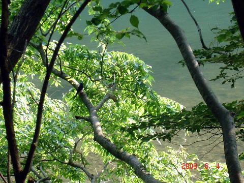 ![]() 旧鷹ノ巣発電所への廃道を行くと、川岸の木にオオルリがとまっていた |
