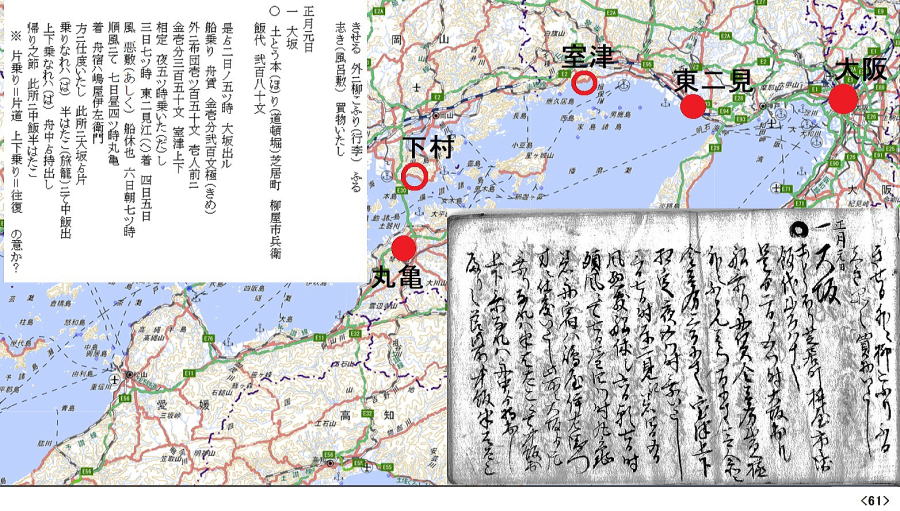 1月1日大阪・泊 2日船・泊 3・4・5日船(東二見で風待ち)・泊 6日船・泊 7日丸亀 |