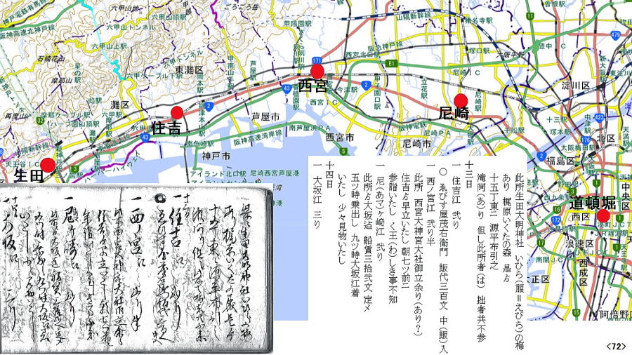 | 1月13日生田~住吉・泊 14日住吉~大坂・泊 ★歩行距離1/13二子~住吉 推定43㎞ 1/14住吉~大阪 推定26㎞ |