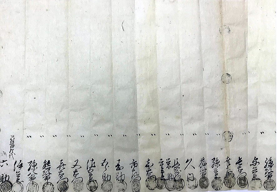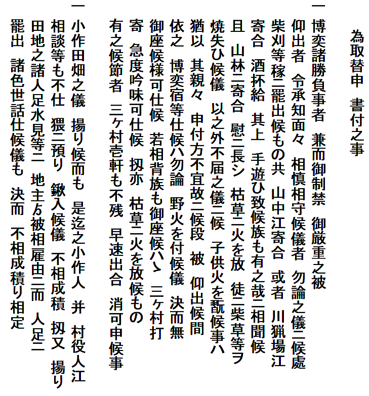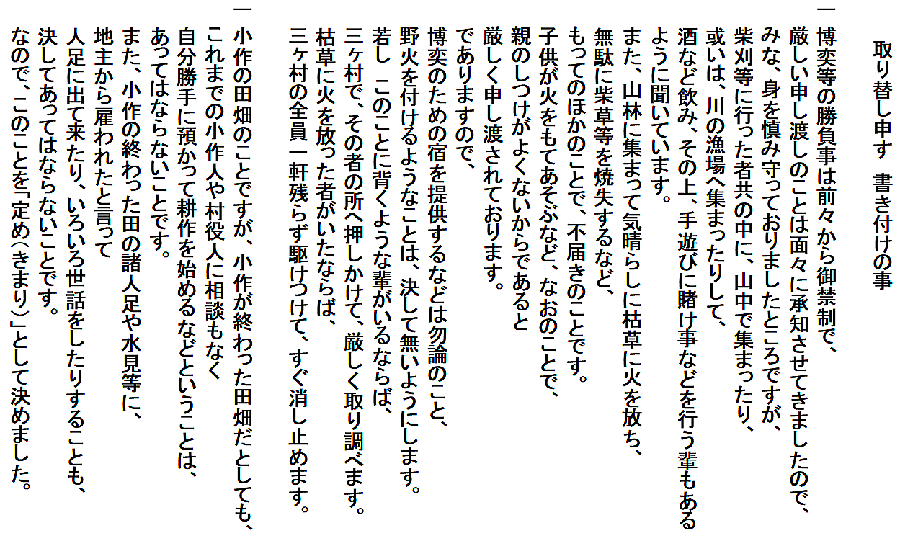 | ②の文書は、二項目の取り決めが書いてあります。 前半は、博奕と野火の禁止で、後半は、小作の取り決めです。 前半の内容は、村の広報紙10月号で紹介した通りです。 博奕と野火の禁止は、一村毎の村定め文書にもたびたび出てくる内容で、当時の代表的な困りごとだったのでしょう。 野火禁止の内容に、柴刈りのついでに山中や川原で飲酒・賭け事をする者がいることや、子どもの火遊びなどが書いてあって、当時の村の暮らしを垣間見ることができます。 禁止令は、ほとんどの場合、そういう行いがあるからこそ出されるものです。 後半の内容は、村広報紙11月号で紹介しますが、小作の問題です。 天明3(1783)年の文書①にも、「三ヶ村は田畑入り組み、互いに出作入作している」とあります。 そんな状況ですから、2項目目に書かれた小作の問題をいい加減にしておくと、だれがどこの小作をしているのか分からなくなる心配があります。そうなると、だれが、地主の責務(納税や用排水管理等の共同作業)を果たすべきなのか、うやむやになってしまう恐れがあったのでしょう。 年貢は個々人に課せられるのではなく、村請制で、村全体の共同責任。それを村内で調整して田畑の持主に按分していました。田畑の持主と耕作者が誰なのかは、その際の重要な問題です。それで、この取決めをもうけたのでしょう。 |