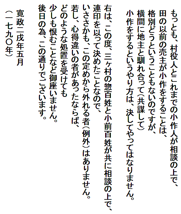| ②博奕・野火禁止、小作の取決め 寛政2(1790)年(文書№566) | |||||