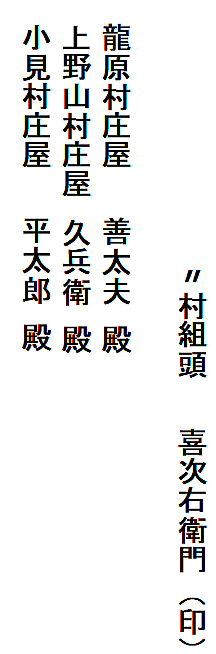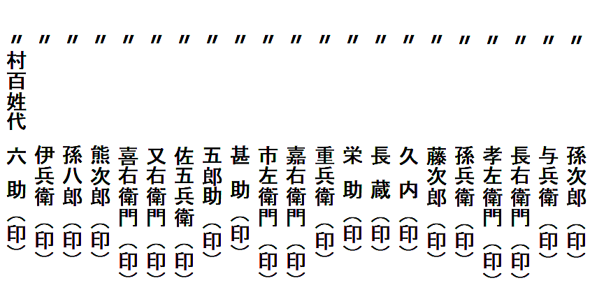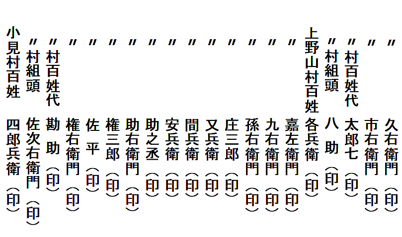 | 滝原村・上野山村・小見村の隣接三ヶ村は、小見村に定着した平田平太郎(甲太郎)家の先祖が開発した村という関係もあるのでしょうか、何かにつけて協力し合ってきた村のようです。三ヶ村共同で取り決めた「定」(さだめ=決め事)の文書が三通残っています。 三通とも、三ケ村の百姓衆が連判し、三ケ村の庄屋宛に提出した形になっています。三ケ村で取り交した念書(約束)ということになります。 江戸時代は、あらゆることが「ムラの自治」で行われていました。絆は強かったのです。絆の元々の意味は、手かせ足かせ。ムラは運命共同体。絆は必然だったのでしょう。 |