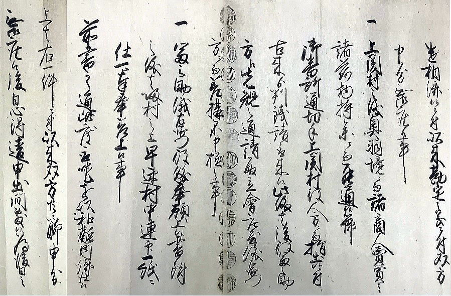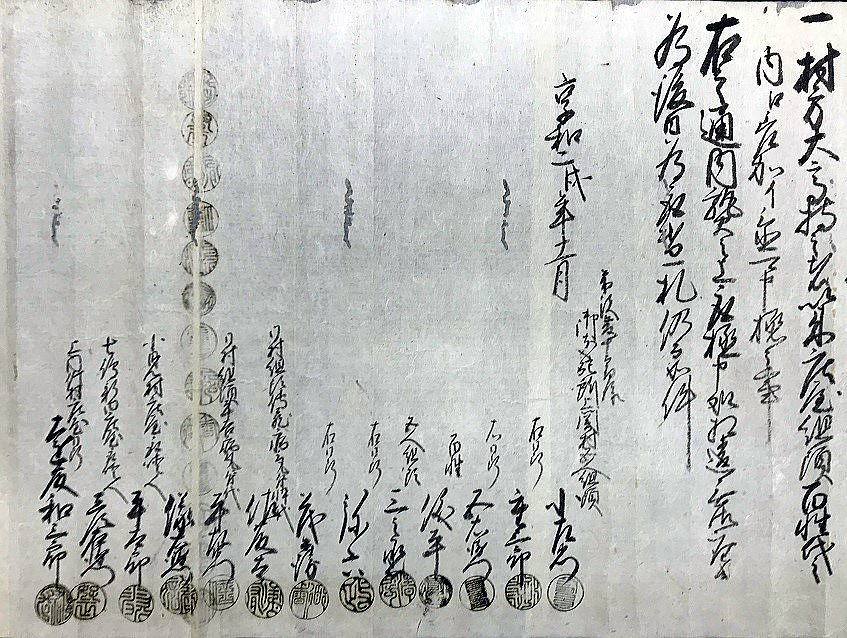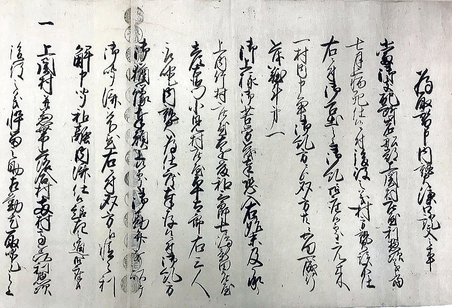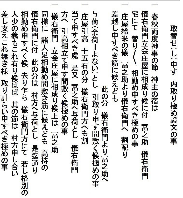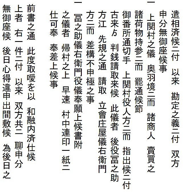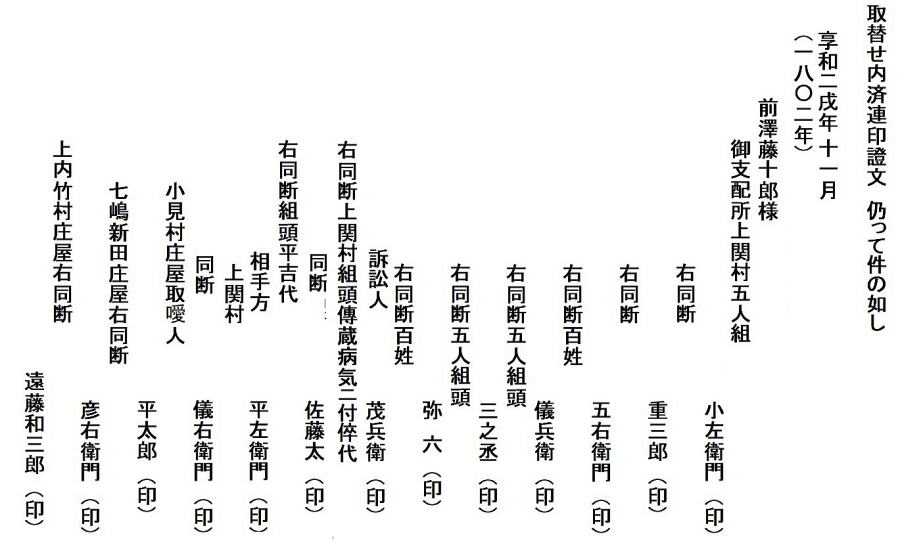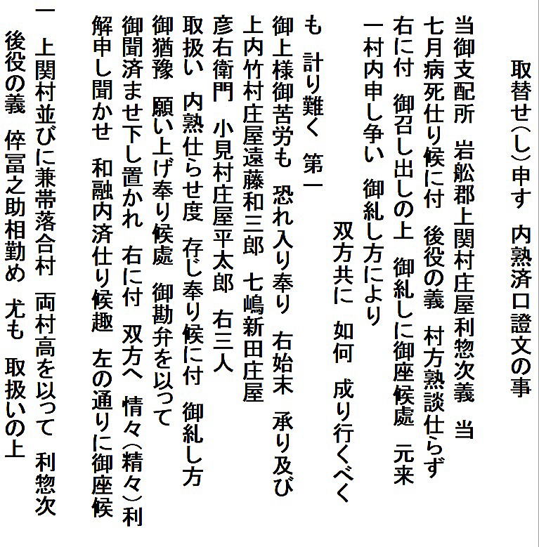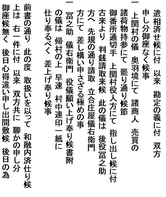 | <解説> ア 事件の概要 上関村庄屋利惣次が享和2(1802)年7月に病死。その後役庄屋を誰にするかで、争いが起きたようです。 庄屋役は村の話合いで人選し、百姓の総意として代官所へ任命を願い出ることになっています。ところが、利惣次の倅冨之助を押す勢力と百姓代の儀右衛門を押す勢力があって、話がまとまらない。 文書①の末尾、記名連印のところを見ると、「訴訟人茂兵衛・同断佐藤太」、「相手方平左衛門・同断儀右衛門」となっています。茂兵衛と佐藤太が、後役庄屋が決まらないのは平左衛門と儀右衛門のせいだと水原代官所に訴えたのでしょう。 佐藤太は上関村組頭傳蔵の倅で、傳蔵が病気の為の代理。平左衛門は同じく組頭平吉が病気の為の代理(文書①では平吉が病気とは書いてないが、文書②には病気とある)。 つまり、冨之助派は茂兵衛と傳蔵、儀右衛門派は当人と平吉ということになります。傳蔵も平吉も庄屋に次ぐ役の組頭。その二人の意見が分かれて、4ヶ月経っても後役が決まらないという異様な事態です。 では、記名連印の最初に並んだ6人は何かというと、五人組とその組頭とあります。当時は、何事も五人組の連帯責任で行われていました。だから、訴訟側と相手側の五人組が、合意成立の証人として名を連ねたのだと思われます。 イ 扱人の介入 庄屋は、代官所の大事な末端行政機関です。それが未定では放置できません。両派の対立で、埒が明かないと見た代官所は扱人を介入させ、和解合意するよう働きかけたのでしょう。 扱人は、上内竹村庄屋(現新発田市上内竹)遠藤和三郎・七嶋新田庄屋(現阿賀野市七島)彦右衛門・小見村庄屋平太郎。この3人が仲裁して合意が成立し、この二文書が作成されました。文書①の前段には次のように書かれています。 「上関村の村内の者が、庄屋後役のことで争っていて代官所の取り調べを受けている。取調べの結果次第では大変なことになるかもしれない。それに、第一、代官所に御苦労を掛けるなど恐れ多い。だから、自分たちが仲介して話合いをまとめるので、取り調べは猶予してほしいと代官所に願い出たところ、代官所の深慮で私たちの願い出を聞いていただいた。それで、両派の者へ詳しく言って聞かせて、この度、和解合意することができた。」 形式的建前的な書き方です。実際は、何とか収めてくれと代官所から頼まれたのでしょう。3人は、他の平田家文書の中にも扱人として登場している水原代官所管内の大物庄屋。人望もあって、代官所からも百姓衆からも、頼りにされていた人物だったのでしょう。 それと、推測ですが、二人の組頭・傳蔵と平吉の対立が深くて、この二人がいては合意が難しいと見た周囲が、二人を外すために病気を理由にして、それぞれ代理を出席させるよう根回ししたのかもしれません。対立する当事者2人が同時に病気になると言うのもヘンです。それに文書①で平吉の病気を書いてないのも、その辺りの事情が匂います。合意への第一障害を取り除こうと、扱人の計らいがあったような気がします。 ウ 合意の内容 (ア) 文書①「内熟済口證文」の合意事項 合意事項は6項目列記されていて、記載順に概略次のような文意になります。 (1) 上関村庄屋は落合村も兼ねている。その庄屋は冨之助とし、儀右衛門は立会庄屋とする。この両人で話し合って役を務めること。諸帳面・諸文書は、冨之助宅に置き、代官所の御用も冨之助宅で行うこと。 (2) これまで儀右衛門が務めてきた百姓代の役は、村方百姓が話し合った上で、茂兵衛が務めること。 (3) 税金や諸割当てなどは、冨之助、儀右衛門、組頭2名、百姓代が、立ち合いの上で決めること。 (4) 利惣次が庄屋在勤中の諸会計は、扱人が立ち会って清算し過不足のやり取りは済ませたので、以後、これまでの会計については双方ともどうこう言わないこと。 (5) 上関村は奥羽国境で、商人が売買の荷物を持って通行する際の番所通行切手は、上関村で発行して判銭(手数料)を取ってきたが、この役は、これまで通り冨之助が行い、儀右衛門は手を出さないこと。 (6) 水原代官所への、冨之助と儀右衛門の任命願いは、帰村して、村中で連判状を作成し提出すること。(文中に「帰村の上」とあるので、合意文書は、記名の13人が水原の代官所内かその近くの会場で作成したことが分かる。) ※ 儀右衛門が就くことになった立会庄屋は、ネット検索では、江戸時代の文書にたまに出てくるようです。が、その意味内容ははっきりしません。 庄屋の上に位置する役か、逆に下に位置する役か。上役であれば複数の村を束ねる大庄屋が該当するが、この時代の上関村を含む幕府領では大庄屋制度はとっていない。下役であれば、副庄屋とか庄屋代理か。(因みに生成AIのMicrosoftBingは上役の説、チャットGPTは下役の説を回答している。しかし、いずれも典拠がはっきりしないので確認できない。) ①と②の二文書を合わせた感じでは、相談役か監査役のような役目のように思われ