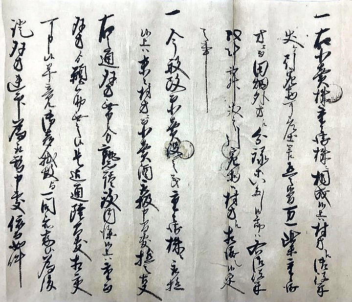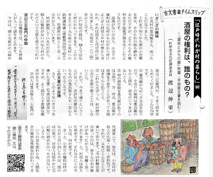| <解説> 1 この文書は、済口證文か?いや、違う! この文書、表題が「済口為取替證文の事」となっていて、一見、済口證文のように見える。 また、文書前段に書かれた四項目は、訴えの内容と反論、そして仲裁と合意の内容が書いてあり、これも済口證文の内容そのものである。 さらに、本文最後の一行に、「後証の為、双方連印取替せ申す処、依って件の如し」と書いてある。これも、まさに済口證文のことである。 だから、ついつい、この文書は争いが納まっての済口證文かと思ってしまう。 しかし、末尾の差出人と宛先を見れば、双方連印して取り交わした文書にはなっていない。済口證文であれば、訴訟人(原告)と相手方(被告)と噯人(取扱い人=仲裁人)が連印する。 ところが、この文書は、訴訟人の重兵衛と仲裁人の渡辺三左衛門の代理が印を押し、宛先は、相手方である小見村三役になっている。 これは一体どういうことだろう。 2 済口證文でなければ、一体、何の文書だ? 文書の末尾をよくよく読んでみれば、この文書は、済口證文を取り交した後で、それとは別に、重兵衛と仲裁人から村三役に出された文書であることが分かる。 なぜ、そんなことをする必要があったのか。 そのなぞを解くカギは、最後から二行目の「畢竟、お声がけ故と一同かたじけなく存じ候」の文言にあることに気づく。 つまり、「このように和解合意の結果に至ったのは、三役からのお声がけがあったからで、ありがたく思っております」と、この御礼を言うために、前段に和解合意の内容、つまり済口證文の内容を書いたのである。 では、なぜ、訴訟の相手に対して、このような礼状を書く必要があったのか。 3 争いの発端 重兵衛は、「数十年、受け売り酒役の役米2斗5升を納めて、揚げ酒渡世をしてきた」と書いてある。受け売り酒とは酒の小売りのことである。役米とは、それにかかる税のこと。揚げ酒渡世とは、酒の小売業、つまり、小売り酒屋のことである。 安政4(1775)年の小見村への年貢割付状(納税通知書)にも「諸売酒屋役 米2斗5升」とある。数十年というから、59年前のこの納税も重兵衛家が行っていたのではないだろうか。 安政4年の小見村年貢割付状は ⇒こちら 江戸時代の様々な商売の権利は「株」という言い方をしていた。株は売買ができた。株売買の時の領収書が株の証文になった。 重兵衛の株は数十年来のもの、売買証文も、おそらくその間必要もなく紛失状態だったのだろう。 どういうわけか、ここへきて、その証文の有無が問題になった。 重兵衛はそれを提示できない。ならば、重兵衛の株ではなく、小見村の株だ。と、「村役人並びに村方が主張した」と書いてある。 「村方」とあるが、それを強く主張した村民がいたということで、村の三役も他の村民も、その強硬論にあえて反対するだけの明確な理由もないまま、表向き同調した形になったということだろう。 4 落とし前をどうつけるか とは言え、数十年、重兵衛家が行ってきた稼業を今さら取り上げるというのも穏当ではない。 そこで、渡辺三左衛門の登場となる。 三左衛門は、酒小売組合の元締めである。長年、組合のメンバーであった重兵衛の難儀を座視できない立場にある。 株の持主たちは、株仲間という同業者組合を作る。文書冒頭の「当組合」とは、まさにそのことを言っている。 だから、三左衛門は第三者ではなく、仲裁人としては中立的な立場ではない。 おそらく、村三役はそれを承知で仲裁に入ってもらったのだろう。三左衛門は下関村の庄屋であり、小見村庄屋平太郎とは親しかったはず。もちろん、訴訟先である代官所も承知の上のはず。 証拠書類を提示できないのは重兵衛の落ち度。それを好機と見て権利を取り上げてしまおうとする一部の勢力。しかし、何十年も続けてきた稼業を取り上げるのは、誰が見ても、強引で不自然。強硬派の振り上げた拳を降ろさせるために、結局、金で落とし前をつけて問題解決。「どうだね、このあたりで、手を打たねかね」と、これが、お声がけの意味なのではないだろうか。 5 この文書に付随したはずの文書 ということで、この文書のほかに、取り交わした済口證文一通と拠出金額を書いた重兵衛の提出文書一通があることになる。残念ながら、その二通は見当たらない。 |