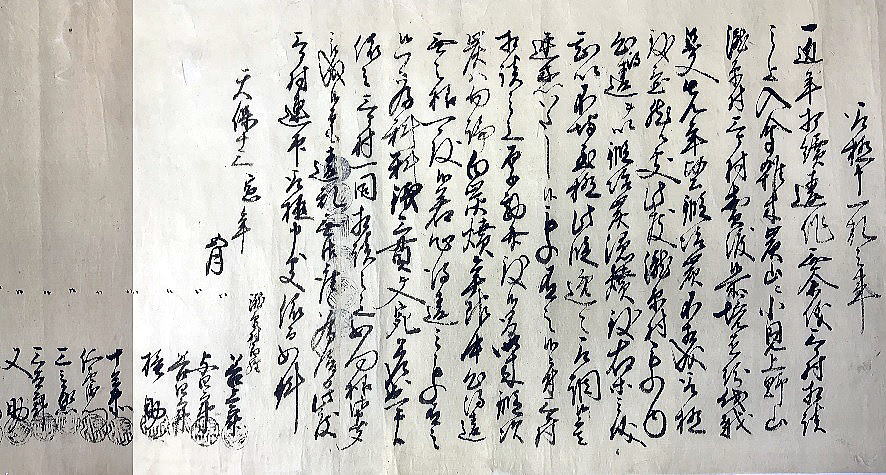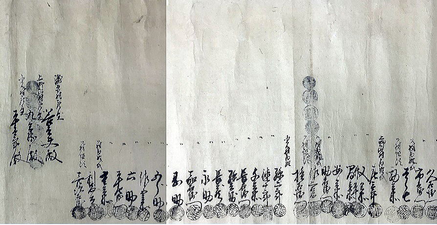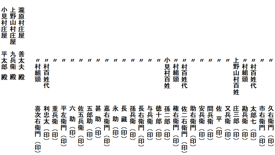 | <文書の解説> 1 時代背景 天保といえば、大飢饉。天保4~8年の冷害で全国的な凶作、それを契機に天保12年から行われた「天保の改革」。歴史教科書でよく扱われる事件。この文書の冒頭に「近年、打ち続く違作(不作)」とあるのは、そういった時代背景がある。 入会山の木は、本来、村内各家の燃料源。それをやむなく炭にして換金せざるを得ない状況だった。 2 文書の作成意図 ところが、問題が起きた。「境を紛れ」とあるのは、単に間違ったではなく、こっそり紛れ込んだの意。何のためかというと、禁止の鍛冶炭用原木を伐るため。「且つ又」は、その上でとか、さらにまたの意。だから、こっそり紛れ込んで木を伐り、その木で鍛冶炭を焼いた。 鍛冶炭を焼くのは、前々から、禁止の取り決めだった。それを破った者が出たから、改めて、今後のための取決めを結んだ。併せて、鍛冶炭だけでなく白炭の取決めについても再確認した。 鍛冶炭と白炭の禁止理由は書いてないので、その考察を広報紙に掲載した。 3 「科銭三貫文宛差出可申候」について 普通に読めば、一人三貫文ずつ差し出すという意味になる。しかし、何人も違反者が出るとは考えにくい。今回の違反も、滝原村者内とあり、多分単数だろう。だから、今回は見逃すことにしたのであって、もし多人数だったら、ほかの二村が許さないだろう。 よって、この「宛」は、一人三貫文ずつではなく、三ヶ村に各村三貫文ずつと、読んだ。九貫文なら約1両半、大金になる。これくらいでなければ、防止策にならない。 4 記名押印者について この文書の人物名と、8年前の三村村定に登場する人物名を比べると、各村1~2名の増減があるが、ほぼ各村の本百姓全員で、炭焼きを行う人だけというわけではないだろう。つまり、入会雑木の払い下げを受けたのは個人ではなく、各村ということになる。 <参考> ※以下、黒文字が両文書に登場、緑文字は、片方のみ。 (1) 天保13(1842)年のこの文書に登場する人名 龍原村14名・・・善三郎 与四郎 善四郎 権助 十兵衛 仁左衛門 三之丞 三太郎 又助 久右衛門 市右衛門 太郎七 勘兵衛 庄屋・善太夫 上野山村9名・・・庄三郎 又兵衛 佐平 間兵衛 安兵衛 助右衛門 佐二右衛門 権右衛門 庄屋・九兵衛 小見村17名・・・孫二郎 徳十郎 与兵衛 長右衛門 孫兵衛 長藏 永助 嘉右衛門 甚助 五郎助 佐五兵衛 六助 平左衛門 重兵衛 利忠太 喜次右衛門 庄屋・平太郎 (2) 天保5(1834)年の三村村定に登場する人名 瀧原村16名・・・仁左衛門 与四郎 五郎兵衛 権助 善四郎 善三郎 市右衛門 三之丞 久右衛門 重兵衛 又助 三太郎 勘之丞 太郎七 八右衛門 庄屋・善太夫 上野山村10名・・・又兵衛 九右衛門 間兵衛 庄三郎 安兵衛 助右衛門 佐兵衛 佐次右衛門 権右衛門 庄屋・九兵衛 小見村15名・・・久米次 嘉右衛門 孫次郎 五郎助 長蔵 六助 佐五兵衛 重兵衛 長右衛門 永助 孫兵衛 利忠太 平左衛門 喜次右衛門 庄屋・平太郎 ※ 通常、代々の名を襲名するが、すぐに襲名できない場合やそれまでの名で通す場合もあったようだ。また、何かの都合で連判状に参加できない人もいたのかもしれない。 |