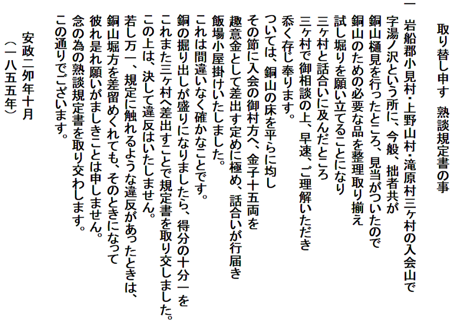 | 平田甲太郎家文書<銅山試掘に当っての取り決め証文安政2(1855)年 文書№697> | |||||