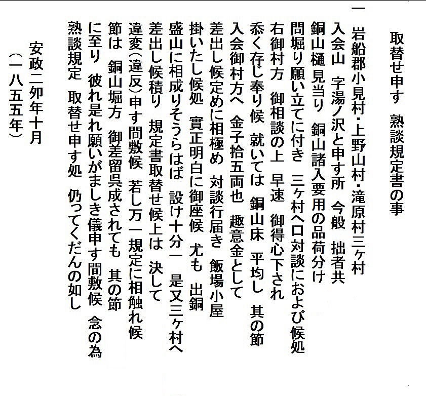 | <文書の解説> 小見・上野山・滝原三ヶ村入会山の湯ノ沢という所に銅山の脈がありそうだということで、試験掘りの工事を行うことになった。その際、鉱山関係者が三ヶ村に提出した取り決め約定の証文である。 歴史館の平田甲太郎家文書の中では、鉱山に関する文書は珍しい。 三ヶ村の承諾を得て、先ずは現場を平らに均して飯場小屋を建てることにし、その際、三ヶ村へ金15両を払うことで合意した。もし、試掘の結果、銅が出ることになって本格採掘に至れば、儲けの10%は三ヶ村の取り分にすることで、規定書を取交したとある。 さて、結果どうなったか?今のところ関係する文書が見つかってなく、定かではない。 1 文書中の用語について 差出人の5名は鉱山の専門家のようで、鉱山用語なのかもしれないが難解な語句が多く、ネットで調べてもヒットしないものも多い。それで、ネット情報を基に、次にように推測してみた。 (3行目)「銅山樋見當り」について 鉱脈探しは沢筋を歩き、崖などから染み出す水や生える植物などを手掛かりにするらしい。露頭の地層や岩の割れ目などに樋を差し込んで、流れ出る水を何らかの方法で分析し、銅の成分を発見したことを言うのではないだろうか。 (3行目)「銅山諸入要用之品荷分ヶ」について 必要と言う意味での要用という言い方はあるようだ。「諸入り要用の品」と読むのだろうか。荷分けは一般用語で、荷物の分類整理。 (4行目)「問掘り」について 鉱山採掘は一般に試験採掘を行うというので、その意味にとった。 (4行目)「願立」について 神仏への願いの意にも読め、それが最初の行事なのかもしれない。しかし、領主である幕府つまりは代官所への願い出のことともとれる。三ヶ村の入会山(共同利用地)とはいえ、採掘には領主の許可が必要だろう。農地開発なら願人とか願出とかいうところを鉱山では願立と言うのかもしれない。 (10行目)「盛山」について 音読みか、訓読みか不明だが、盛りという意味で、本格的な採掘で銅がでるようになることをこのような用語で言うのかもしれない。 (10行目)「設ヶ」について 「儲け」の当て字とも思えるが、古文辞典では「設け」と「儲け」は同義語のように扱っているものもある。 差出人の肩書 「福田所左衛門支配所」について・・・福田所左衛門は当時の水原代官 「山見立人」について・・・文字通り、山を見て選び定める人であろう。 「山崎」について・・・鉱脈の発見者を「山先」あるいは「山崎」と言ったらしい。佐渡相川町には、金山発見者にその名を与え、そこから山先町という地名があったとのこと。 「山師」について・・・鉱山の発掘事業者であり経営者。 蔵光(幕領)は現新発田市、三日市御領(藩)は現新発田市上館に藩庁、村松御領(藩)は現五泉市村松に藩庁があった。 幕府領は天領とも言い公領、大名や旗本の領地は私領で、それを御領と言っていたことが分かる。なお、江戸時代に「藩」という用語はない。 2 文書の時代背景 この文書の安政2年といえば、13年後には明治維新となる幕末動乱期。大砲、造船、何かにつけ鉄や銅などの鉱物資源が必要とされた時期。 そのために銅山の開発も奨励されていたのかもしれない。しかし、当時の大砲などは青銅製から鉄製へ変換が進んでいたから、必ずしも武器等のための銅山開発とは限らないかもしれない。 それよりも、江戸時代初期から、我が国では、長崎で銅の輸出が盛んにおこなわれ、一時は世界トップクラスだったという。時代が進むと銅の産出が衰え輸出量も減少したとのこと。明治になって、改めて銅山の新開発(足尾、別子等)が行われている。 安政2年の頃には、列強から開国を迫られた幕府は、通商を逃れるべく和親条約で切り抜けていた。しかし、いずれ通商条約を結ばざるを得なくなることも見据え、有力輸出品の銅の増産を企図していたのではないだろうか。 ただし、実際には、生糸の輸出が圧倒的で、次が茶。銅はそれほどの輸出量にはならなかったようである。 3 湯ノ沢について 三ヶ村入会山の湯ノ沢とはどこかと、関川村発行「山岳渓流地図」で三ヶ村の近くを探したが、該当する地名や沢はない。 他の文書(№531)から、荒川と大石川の出合にあった中島にもこの三ヶ村の入会地があったことが分かっているので、どこか離れたところに湯ノ沢があった可能性もあるが、今のところ不明。 |