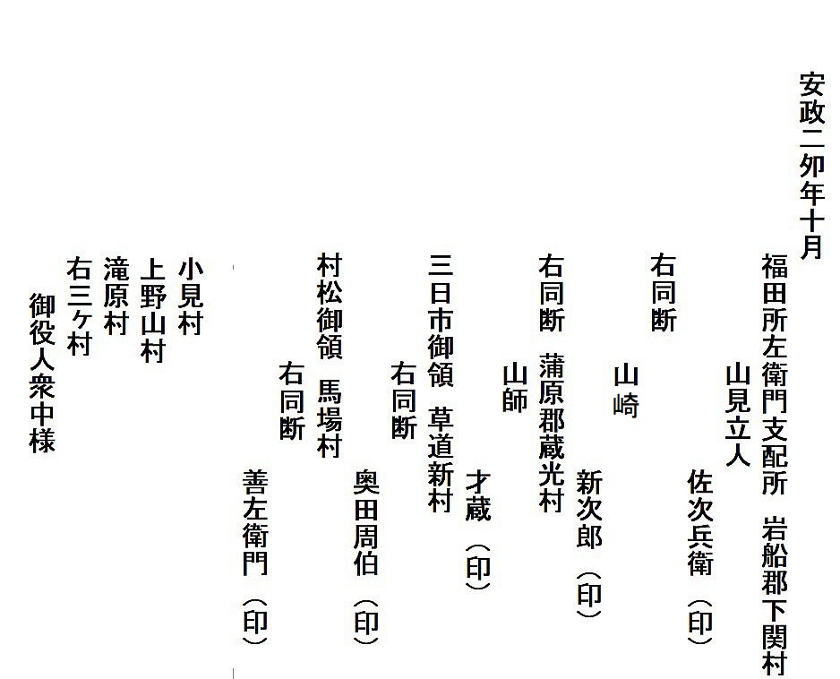 | ※ このとき、水原代官所役人が小見村庄屋平太郎の案内で事前見分しています。 その際の関係文書は⇒こちら |