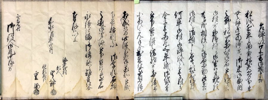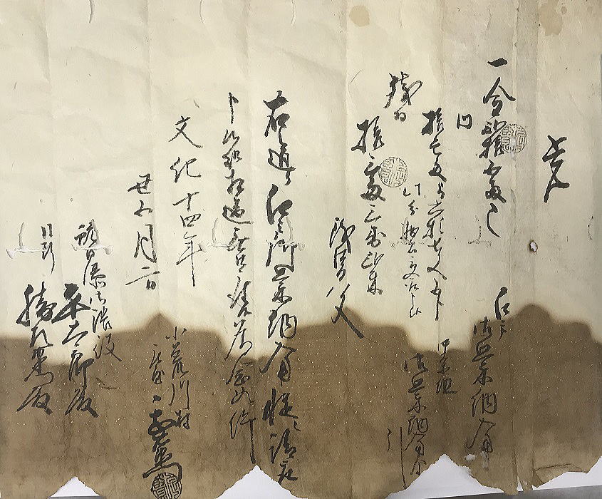 | <解説> 荒川左岸河口にある海老江には、江戸時代、良港がありました。物流の拠点です。荒川を上下する川舟、沖に停泊する千石船へ荷の積み下ろしに行き交う艀(はしけ)。大変な賑わいだったといいます。その海老江の一住人から、小見村への貸付金の依頼状です。この文書から、小見村と海老江村の意外な関係が分かります。そして、当時の年貢米上納の仕組みが垣間見えてきます。 文中、「御米御蔵納の節」、自分の家を宿にしてくれている村が二十ヶ村もあるとあります。懇意にしているその村々へ、一村一両ずつ三ヶ年賦の貸付依頼。小見村もその一つです。「御米御蔵納の節の宿」とは、何のことでしょうか。 村々の年貢米は、郷倉(ごうぐら)という年貢米用の蔵へ、近在近郷まとめて一旦納められた後、翌春、川舟で海老江の幕府御蔵へ納めます。これが文中の「御米御蔵納」です。 岩船郡と蒲原郡の幕府領の年貢米がここへ集まります。そして、日本海沿岸の廻船・千石船が沖合に停泊するのを待って、海老江の蔵から艀(はしけ)で千石船へ積み出されます。 海老江に御米御蔵納の際、郡内の代表庄屋の当番が、納税作業が終わるまで泊まり込んで作業の指示や管理監督に当たっていました。そのための定宿を持っていたわけです。 この文書の差出人はそこの宿主で、長年の付き合いを頼りにして貸付を依頼しています。共助のセーフティーネットが発達していた江戸時代のこと、各村、気持ちよく融通して宿主の危機を救ったのではないでしょうか。すべては日頃の信用度次第ですが。 ところで、納税の作業は、海老江湊からの積み出しで終わりではなく、廻船が江戸や大阪へ無事到着するのを確認し、幕府の蔵に納まるまでを管理監督することも納税側の責務で、そのために、郡内の代表庄屋が当番で新潟や江戸に出張して滞在していました。廻船に乗込む当番もあったそうです。(「文書b」及び「関川村史」参照) 教科書的には、村々に出張ってきた御役人が農家の庭先で年貢米を検査して運び集めていく様子がイメージされますが、とんでもない、米による納税というのはなかなか大変な負担を伴っていたことが、三通の文書から浮かんできます。 |