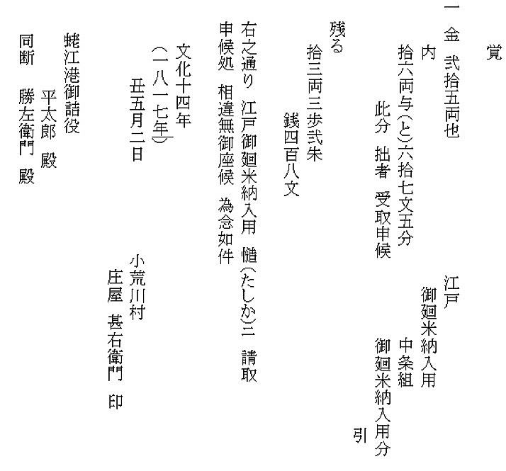 | ② 江戸廻米入用受取書 文化14(1817)年 平田家文書№685 | |||||