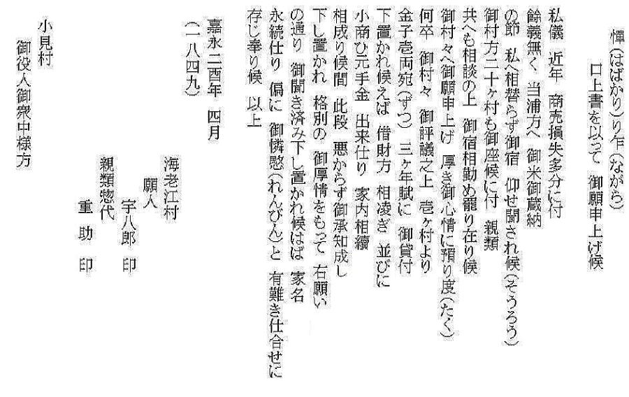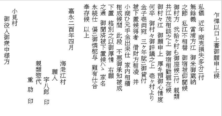 | ① 海老江住民からの貸付依頼状 嘉永2(1849)年 平田家文書№666 | |||||
