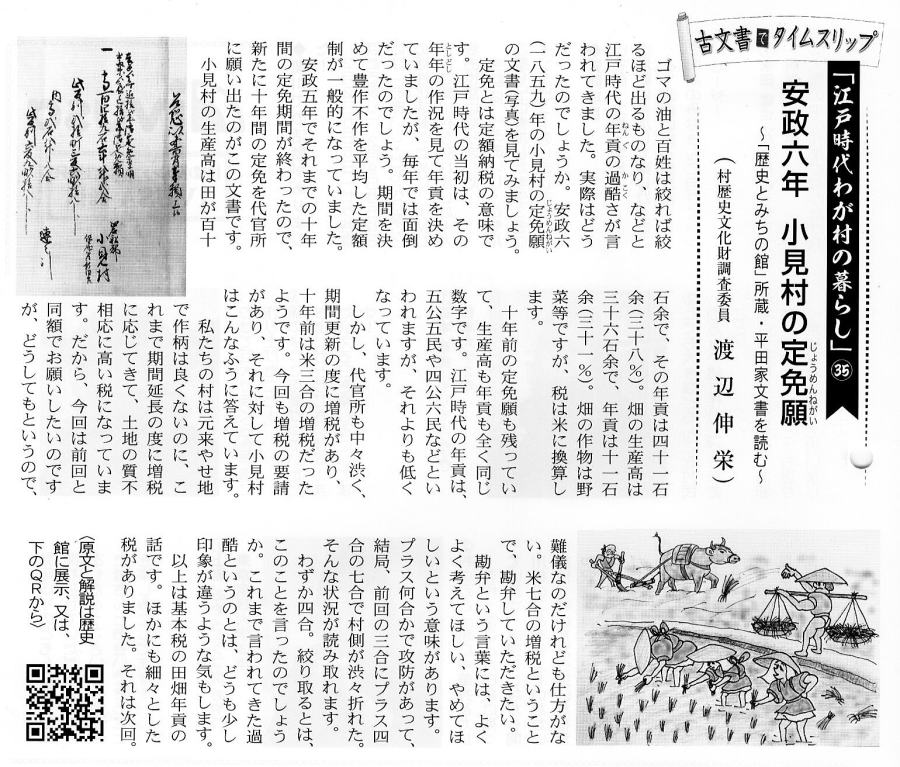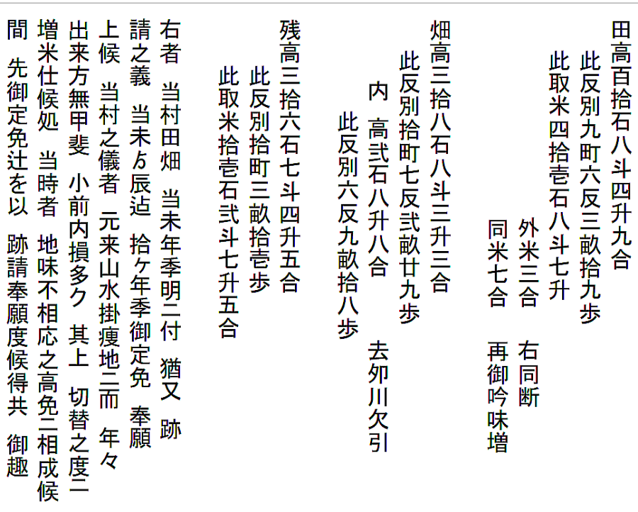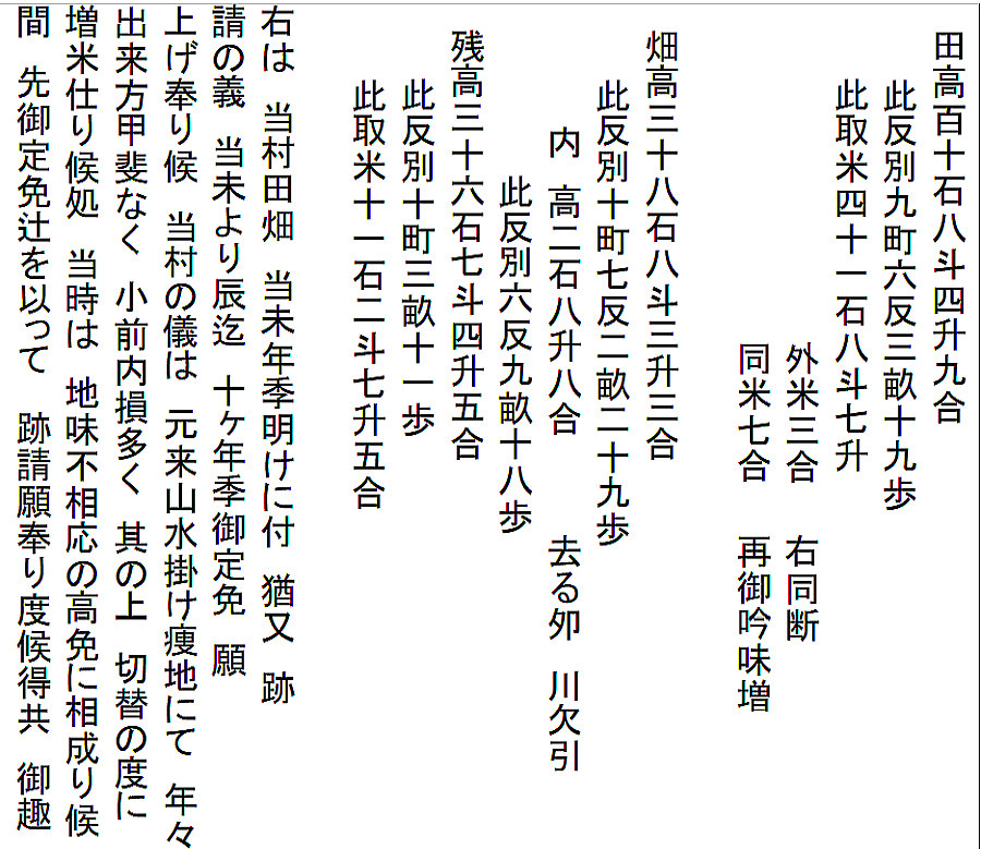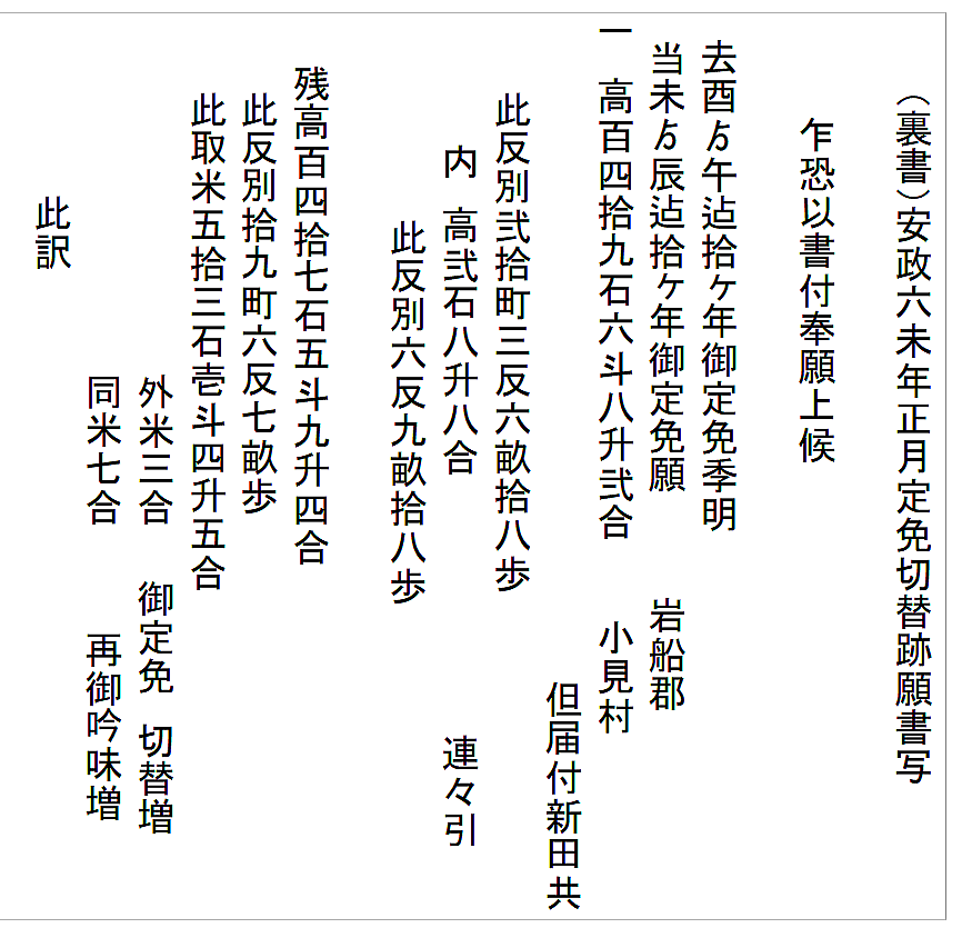 | <文書の解説> 江戸時代の年貢納税の仕組みが具体的に分かって、面白い文書です。 1 定免(じょうめん)について 免とは年貢の賦課率のこと。その年々の作柄を調べて年貢高を決めるのが検見(けみ)法。 それに対し、一定期間を区切って平均の課税額を定める方法を定免という。 小見村は、嘉永2(1849)年から安政5(1858)年までの10年間の定免期間が終わり、改めて安政6(1859)年から10年間の定免を願い出た。それがこの文書。 奇しくも、定免期間が終わる10年後の1868年辰年は明治維新の年に当たるが、願い出の時点では、もちろんそれは分からない。 2 文書の前段の数字について 最初に書いてある高149石余は、検地で定められた小見村の村高(生産高)で、20町余は田畑の面積。これが、税はじめ各種負担の基礎数字となる。 連連引きとは、そこから生産不可能の土地分を引くこと。 残高147石余と19町余が、課税の対象。 取米とは、年貢米のこと。取米53石余を147石余で割ると賦課率は36%になる。 此の訳以下の記述は、上記の石高・面積を田と畑に分けたもの。 連連引きの内容は、夘年に大水で畑が欠損した分を差し引いたことが分かる。永久的に欠損すると永引きという言い方になる。 取米、つまり年貢分は、田畑合わせて53石余となり、前段の数字と合致する。 上述の課税率には畑の分も含まれている。それで、田だけで計算してみる。 取米41石余/田高110石余=38% ほぼ四公六民になるが、4割を下回っているのは、地味が劣る下田が多いせいと思われる。 なお、田高110石余を田9町余の数字で割ると、1反当りの収量は約11.5斗となる。 江戸時代初期の基本は、1反が1石生産できる田で、それは大人1人1年分の米150㎏の生産となる。江戸時代の半ば以降は、1反の生産量は200㎏位に上がっていたという。 小見村の1反当りの収量11.5斗は、172㎏。文書にある通り、地味がよくない田ということになる。 また、畑はどうかと見てみると、畑高36石余を畑10町余で割ると、1反当り収量は3.6斗で計算していることが分かる。 そして、畑の税率は、取米11石余/畑高36石余=約31% 畑の年貢は、金納の地域もあったとされるが、当地域では年貢米として納められていたことになる。 連連引きは、卯年の洪水によるとなっている。この文書より以前の卯年は安政2(1855)年になる。しかし、この文書より10年前の定免願にも、同じく卯年の洪水で、連連引きの畑面積も全く同じことが書いてある。ということは、もっと以前の卯年、天保14(1843)年の洪水からずっと連連引きの対象になっていることになる。あるいは、もっと以前からの連連引きなのかもしれない。 いずれにしろ、10年前の定免願と全く同文の文書を使っているので、単純に前回通りということで処理しているのかもしれない。 10年前の定免願は ⇒こちら 3 本文の意味について (3行目から) 小見村は、元来山水を用水にするやせ地で作柄はよくないところ。 その上、定免年季の切替(延長)の度に増米してきた。 それで、現在、高免状態になっている。 (当時とは、現在の意味。地味不相応の高免とは、土地の質に不相応の高免になっていること。高免とは、高い賦課率のこと。) だから、これまで通りの率で定免を願い出たいのだが、 (先御定免辻とは、これまでの定免の年貢でという意味。) (辻とは、高辻ともいい、年貢のこと。) しかし、御趣意(代官所の意向)もあるので、難儀なのだけれども、切替(延長)の増米を受け入れることにした。 だから、どうか書面にある分の増米で勘弁してほしい。 (勘弁は、お許しくださいではなく、よくよく考えて算段してほしいの意味。やめてほしいの意味もある。) 増米の高については、書面にある分でとある。その書面には、切替増(きりかえまし)3合と再吟味増7合の2通りの数字が書いてある。 これを単純に読めば、3合に7合追加して1升の増米とも読める。 しかし、10年前の定免願を見れば、切替増は4合と書き、それを3合に書き直してある。 10年前の文書は下書きなので、事前検討で3合でお願いすることに修正したようだ。 それで、10年後のこの文書でも、切替増は3合で願い出た。 しかし、代官所との交渉で、今回は4合追加して結局7合の増米になった。 こういうことではないだろうか。 4 まとめ 教科書的には、「百姓は生かさず殺さず」の言葉に代表されるように、年貢は強圧的にむしり取られるという印象が強い。 しかし、実際の古文書から感じる雰囲気は、決してそうではない。 耕作不可能地はちゃんと引いている。極端に不作の年は、定免期間内でも、臨時の検見が行われて、賦課率を変えたともいわれる。 10年間、作柄の良し悪しがあったとしても平均して36%の課税で、四公六民が守られ、しかも、地味に合わせて内輪の率になっている。 それに、江戸時代の税は村請制で、村単位の課税。だから、7合の増税も一村で7合。それほど過酷な増税というようには思えない。勿論、納める側とすれば少ないに越したことがない。だから、3合4合と少量でも、