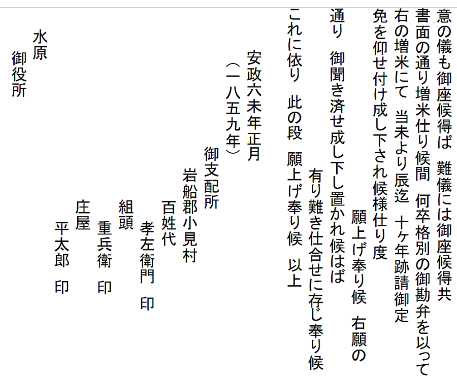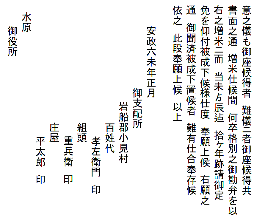 | 平田甲太郎家文書<小見村の定免願 安政6(1859)年 文書№705> | |||||