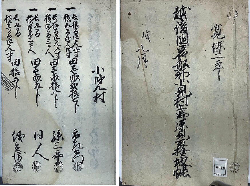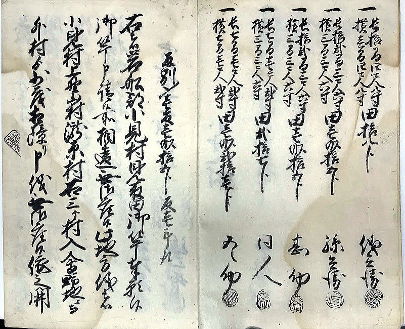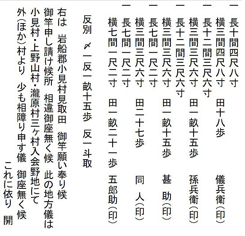 | <解説> 小見村・上野山村・瀧原村三ヶ村の入会地「上野原」を新田開発した際の見取検地帳です。見取検地とは、新たに開発した田への年貢を決めるための検地のこと。 三ヶ村それぞれの村で見取検地が行われ、この文書は、小見村分の検地帳になります。 小見村分は、9か所で持主は6人。9か所の田の縦横寸法と面積が記してあり、合計面積は1反1畝15歩とあります。 新田開発は、鍬下年季と言って一定期間は免税になり、その期間が終わると見取検地が行われ、年貢額が決まります。 合計面積の後に、「反1斗取」とあるのが年貢でしょうが、それにしてはずいぶん少ない。 安政6年(1859年)の小見村定免願(文書№705)では、田の年貢は、9町6反余に対し41石で、1反当り4斗余。それから見ると、反1斗はずいぶん少なく、畑並みの課税率です。それほど収穫の悪い田ということでしょうか。疑問です。 原海御役所というのは、この時代、現関川村の大部分は庄内藩預地で、原海は幕領預地を管轄する庄内藩代官所の所在地で、鼠ヶ関の付近になるようです。金野以下4名はそこの役人ということになります。 |