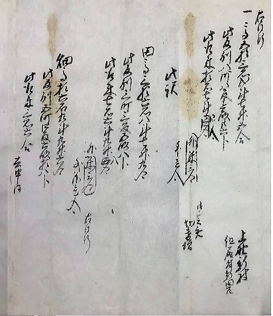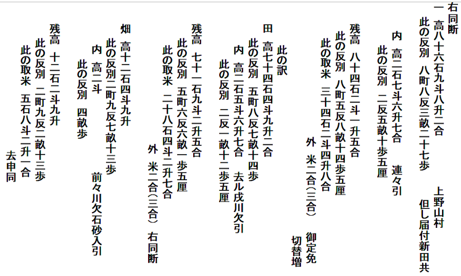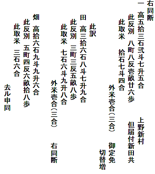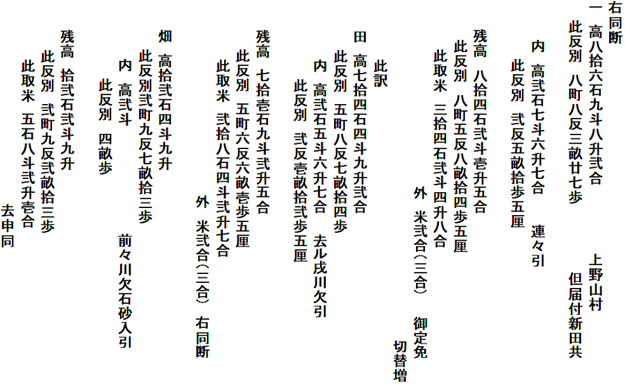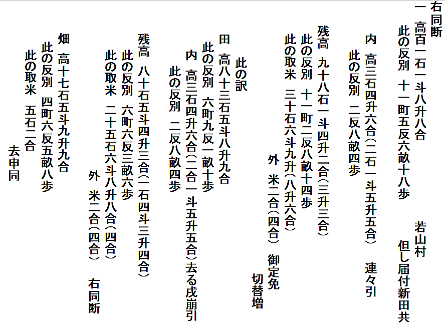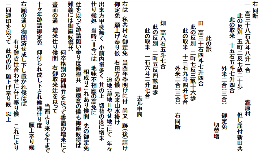 | <解説> 1 「定免願」の意味 小見村・若山村・上野山村・上野新村・新保村・瀧原村6ヶ村連名の定免願です。 「免」とは、年貢の賦課率のことで、一定期間を区切って平均の年貢高を定める方法が「定免(じょうめん)」です。江戸時代の初め頃は、その年ごとに作柄を調べて年貢を決める検見(けみ)法でしたが、その後は、定免が一般的になったとされています。 この文書の前年(嘉永元年)に、それまでの10年間の定免期間が終わり、改めて、嘉永2年から10年間の定免を願い出たことが、小見村の最初の2行に書いてあります。次の村から冒頭の「同断」は、「この2行と同じ」の意味です。 2 「定免願」の内容 以下は、各村、同じ書式です。それを箇条書きにすると、次のようになります。 ①「村高」(村の生産高)と「反別」(耕地面積) ・・・これは、新田も含め検地によって村ごとに決まっている課税の基礎数値 ②「内」・・・①の内、「連々引」、つまり生産不能地のため差引かれる高と反別 ③「残」・・・①から②を差し引いた残りの高と反別、これが課税対象 ④「取米」・・・これが、③に対して課税される年貢 ⑤「御定免切替増」・・・定免期限切れ再延長の度に割増の年貢が負わせられた分 ⑥「此の訳」・・・①の「村高・反別」の「田畑」別の内訳 「連々引」の対象が田か畑かや、生産不能の理由が書いてある 取米(年貢)の田と畑の分が書かれ、課税率の違いが分かる 畑は、実際の作物の値を米の量に換算し、年貢も米で納める この文書は、代官所に提出するための下書きです。 各村の末尾に「去申同」とあるのは、前回定免期間終了年(つまり去年の申年)と同内容という意味でしょう。村での事前検討用に、まず、前回と同じ内容を書き、それを検討した上で現状に合わせて多少変更したのが、囲みの数字ではないかと思われます。 釈文・読下し文では、囲みの数字は( )にしてあります。 「御定免切替増」は、前回より1合程少なく書き直してあります。少なめに清書(申請)して、代官所と交渉しようという魂胆ではないかと推測しています。 切替増以外では、逆に数字が多くなっている箇所もあります。現状に合わせて替えたのかもしれません。 各村の数字を並べた後に、願い出の「本文」があります。 この文書の10年後の小見村の定免願が残っていて(⇒こちら)、それを見るとほぼ同文です。 6ヶ村の田畑はやせ地であること、それなのに、切替の度に増米(増税)を要求されて困っていること、しかし、代官所の意向も無視できないので、このくらいの増米にしてほしいことなど、10年後の文書にも同じ内容が書いてあります。 つまり、「本文」も決まった書式があって、それに合わせて前回と同じ文を書いたと思われます。 それにしても、1合2合とわずかの交渉です。税を取る側も納める側も、そのわずかが、大事なのでしょう。 3 反当収量と課税率 大人一人一年間に食べる米の量を1石とし、1石の米がとれる田の面積を1反としたのが基本です。 ただし、江戸時代が進むと収穫量が上がり、1反からは1石以上の米がとれるようになっています。また、田の地味によって上・中・下・下下と分け、それに応じた収穫量を見積もって、課税率も変えていたようです。 6ヶ村各村の田畑別の反当収量と課税率を計算してみると(下の表)、田の反収では1.27石~1.11石、畑の反収では0.51石~0.31石と村によって違いがあります。また、田の税率は20.9%~45.8%、畑の税率は17.7%~47.7%で、これも、村によってかなり違います。(畑は、米を作るわけではなく、野菜などの収穫物を米に換算していたということです。) 下の表を見ると、課税率は、必ずしも反収と関連しているわけでもなく、どのようにして決めたものか疑問です。この十年後の小見村の定免願を見ると、前回と全く同じに数字と文で文書を作っています。このことからすると、「前々からこうだった」と、単純に継続させているような気がします(微調整はあったでしょうが)。 6ヶ村の数字を単純合計して、課税率を見てみると、田は35%、畑は29%になります。幕府領の年貢は四公六民が基本と言われていますが、それよりも、内輪で収まっています。よく言われがちな江戸時代の苛政は、我が村には当てはまらないように見えます。 もちろん、税金は、田畑の年貢だけでなく、山野からとれる様々な物品にも課税されていたので、ここの数字だけで軽々に論じることはできませんが。 ※ 「原文」「釈文」「読下し文」の末尾に、各村ごとの数字を横書き算用数字にしてあります。(興味ある方は、そちらへ飛んでください。⇒末尾へ) |