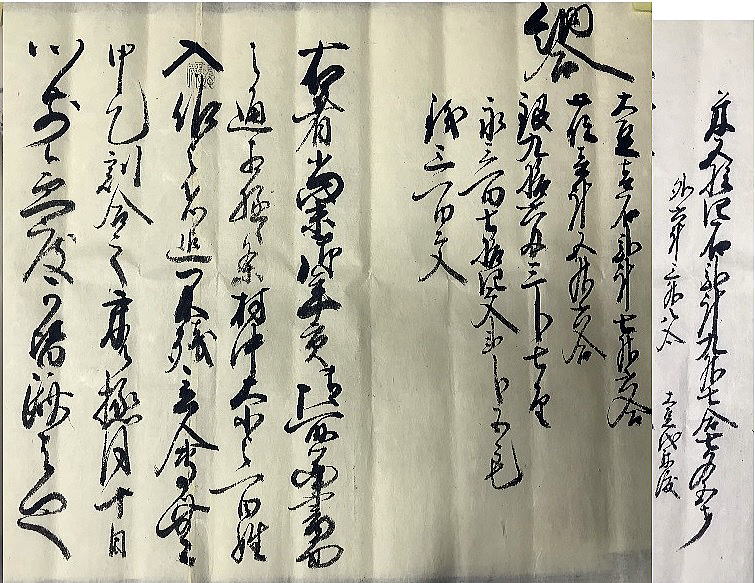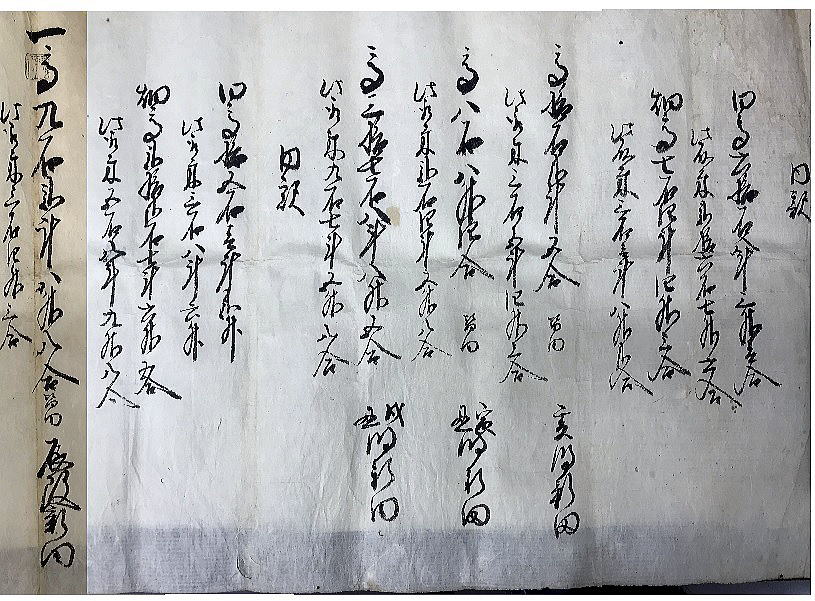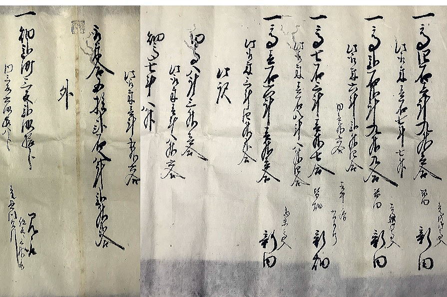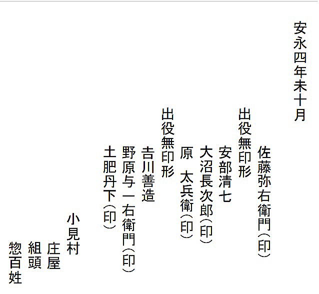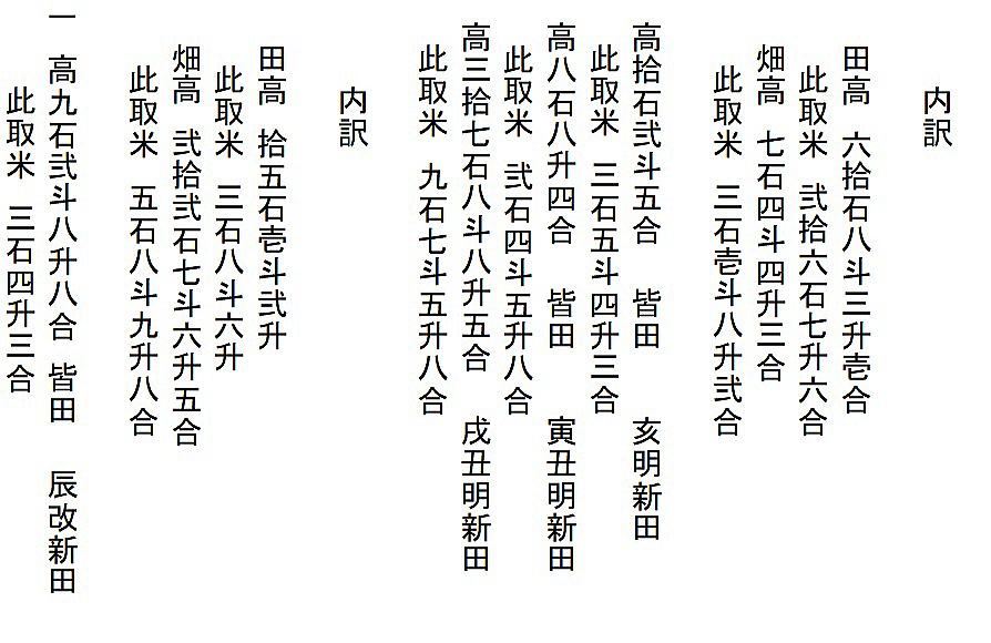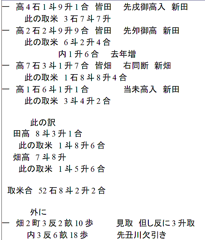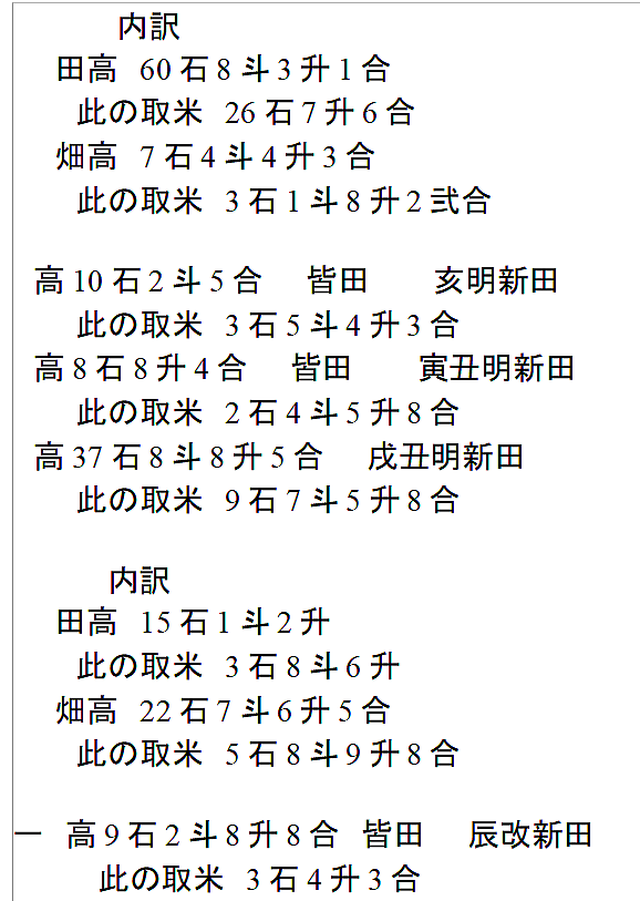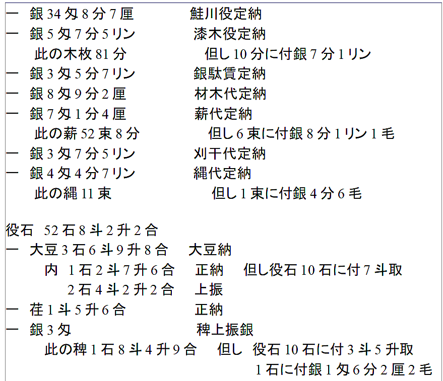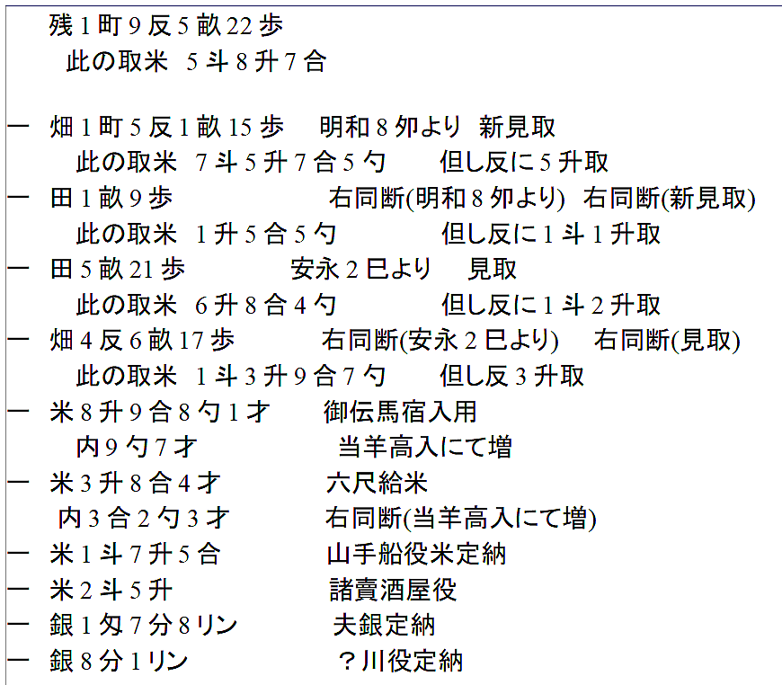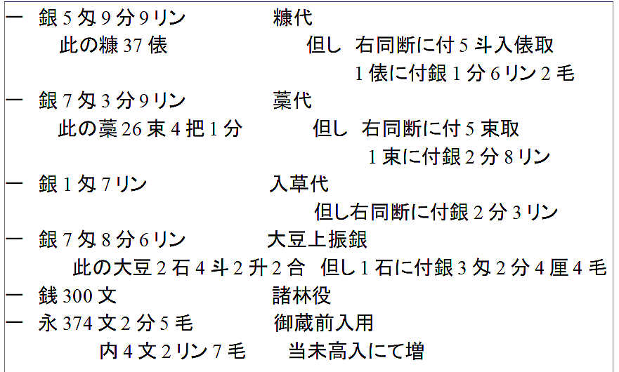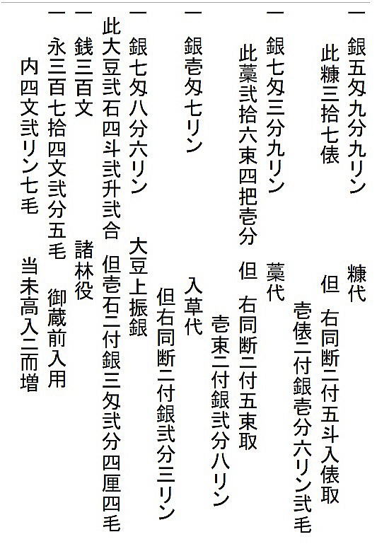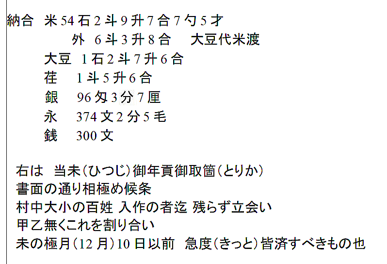 | <解説> 年貢割付状とは、納税通知書のことで、この文書は小見村に出された安永4(1775)年のもの。当時は米沢藩の預領だったので、末尾にある差出人は、上関にあった代官所(陣屋)の役人と思われる。 文書に書かれた税を項目ごとに整理すると、以下のようになる。 ~本 税~ 本来の年貢のことで、田畑の生産高に応じて課税する。それで、文書には、田畑の生産高と年貢(取米)がセットで書いてある。 年貢だけを取り上げて整理すると、次のようになる。 本税1 前葉が欠けているため、文書は、いきなり内訳から始まっている。 田 26石7升6合 畑 3石1斗8升2合 本税2 新田畑3か所 亥明新田 田 3石5斗4升3合 寅丑明新田 田 2石4斗5升8合 戌丑明新田 田と畑 9石7斗5升8合 この文の次の「内訳」は、戌丑明新田の田畑別の税で、ここでは省略する。 本税3 新田畑 5ヶ所 辰改新田 田 3石4升3合 先戌御高入新田 田 3石7斗7升 先夘御高新田 田 6斗2升4合 先夘御高新畑 畑 1石8斗8升4合 当未高入新田 田と畑 3斗4升2合 この文の次の「内訳」は、上記同様で省略。 本税合計 52石8斗2升2合 文書に「取米合」として、この数字が書いてある。これが、本税(年貢)の合計。 ところが、上記の本税1,2,3を合計すると、44石9斗2升2合になり、7石9斗足りない。 つまり、不足分のこの数字が、欠落した前葉に書いてあったことになる。 ~諸 税~ 江戸時代の税は、本税と諸税に大別できる。 「取米合」(本税合計)の数字の次に、「外」と書かれてある。本税の外にという意味で、ここから以下が、諸税ということになる。 文書では、「外」の文字に続いて諸税を列記してあるが、ここでは、種類ごとに分けて整理する。また、文書には記載されていないが、種類ごとの合計も算出する。 諸税1 見取 5ヶ所 見取とは、新規開発した田畑などで収穫が不安定なため、本税の対象である村高(村の生産高)には算入していない土地のこと。本税とは別扱いしていることになる。 5ヶ所それぞれの面積や課税割合も書いてあるが、それは省略して税だけを整理する。 見取 畑 5斗8升7合 明和8夘より新見取 畑 7斗5升7合5勺 同上 田 1升5合5勺 安永2巳より新見取 田 6升8合4勺 同上 畑 1斗3升9合7勺 諸税1の合計 1石5斗6升8合1勺 諸税2 米納 ①御伝馬宿入用 米 8升9合8勺1才 ②六尺給米 米 3升8勺4才 ③山手船役米定納 米 1斗7升5合 ④諸売り酒屋役 米 2斗5升 諸税2の合計 米 5斗4升5合6勺5寸 諸税3 銀納 ①夫銀定納 銀 1匁7分8厘 ②?川役定納 銀 8分1厘 ③鮭川役定納 銀34匁8分7厘 ④漆木役定納 銀 5匁7分5厘 ⑤銀駄賃定納 銀 3匁5分7厘 ⑥材木代定納 銀 8匁9分2厘 ⑦薪代定納 銀 7匁1分4厘 ⑧刈干代定納 銀 3匁7分5厘 ⑨縄代定納 銀 4匁4分7厘 諸税3の合計 銀 71匁6厘 諸税4 現物納 ①大豆納 大豆 3石6斗9升8合 ②荏(エゴマ) 1斗5升6合 諸税5 銀納 ①稗上振銀 銀 3匁 ②糠代 銀 5匁9分9厘 ③藁代 銀 7匁3分9厘 ④入草代 銀 1匁7厘 ⑤大豆上振銀 銀 7匁8分6厘 諸税5の合計 銀 25匁3分1厘 諸税6 銭納と金納 ①諸林役 銭 300文 ②御蔵前入用 永 374文2分5毛 ~総合計~ 文書の最後には、この年に納めるべき税としての総合計が次のように書いてある。 米 54石2斗9升7合7勺5才 外に 大豆代米渡し 6斗3升8合 大豆 1石2斗7升6合 荏(エゴマ) 1斗5升6合 銀 96匁3分7厘 永 374文2分5毛 銭 300文 総合計に書かれた数字は、次のように解釈される。 (1) 米 54石2斗9升7合7勺5才 について 本税分は 52石8斗2升2合 だから、これに諸税分 1石4斗7升5合7勺5才 を合わせた数字になる。 ところが、諸税分は、諸税1の1石5斗6升8合1勺 と諸税2の5斗4升5合6勺5寸 で 合計2石1斗1升3合7勺5才 になるはず。それなのに、 1石4斗7升5合7勺5才では、6斗3升8合 足りない計算になる。 この 6斗3升8合が、総合計の「大豆代米渡し」分の数字と合致する。 つまり、諸税1と諸税2の合計は2石1斗1升3合7勺5才なのだが、そこから、「大豆代米渡し」分の6斗3升8合を差し引き、その6斗3升8合を外に出した形になっている。その理由は分からない。 (2) 大豆 1石2斗7升6合 について 諸税4の大豆納は 3石6斗9升8合で、その内訳として、正納1石2斗7升6合、上振2石4斗2升2合となっている。大豆の現物納は、正納の数字に合っている。ということは、上振の数字分は、米で代納し、その換算分が「大豆代米渡し」 6斗3升8合に当たることになる。 (3) 銀 96匁3分7厘 について 諸税3の9税目合計が 71匁6厘 で、諸税5の5税目合計が 25匁3分7厘となり、銀納は、14税目合計で 96匁3分7厘 になる。 (4) 永 374文2分5毛 について 永は、金貨が4進法で計算しにくいので、10進法で計算するために使われた計算上の単位。 永250文が金1分(1両の1/4分)になる。だから、永 374文2分5毛は、ほぼ金1.5分になる。 (5) 銀、永、銭の納税額を全て金に換算したとしたら 銀96匁3分7厘=9637厘 金1両=銀60匁=6000厘 銀9637厘/6000=1.6両 永374文2分5毛 永250文=金1分 永374.25/250=金1.497分 金1両=4分 金1.497分/4=0.37425両=37/100両=3/8両 銭300文 金1両=銭6500文 銭300/6500=0.046両=5/100両 全て金貨に換算すると 1.6+0.37425+0.046=2.02025両 で、ほぼ2両ということになる。 <補足> 諸税4の箇所からは、「